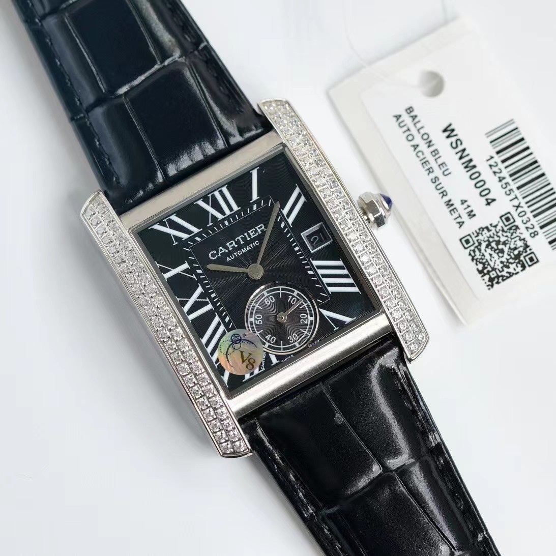 Baignoire Silver Diamond Case Black Leather Strap