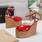 ALAIA WEDGE SANDAL IN CRIMSON RED GLOSSY CALFSKIN AND BEIGE RUBBER