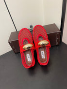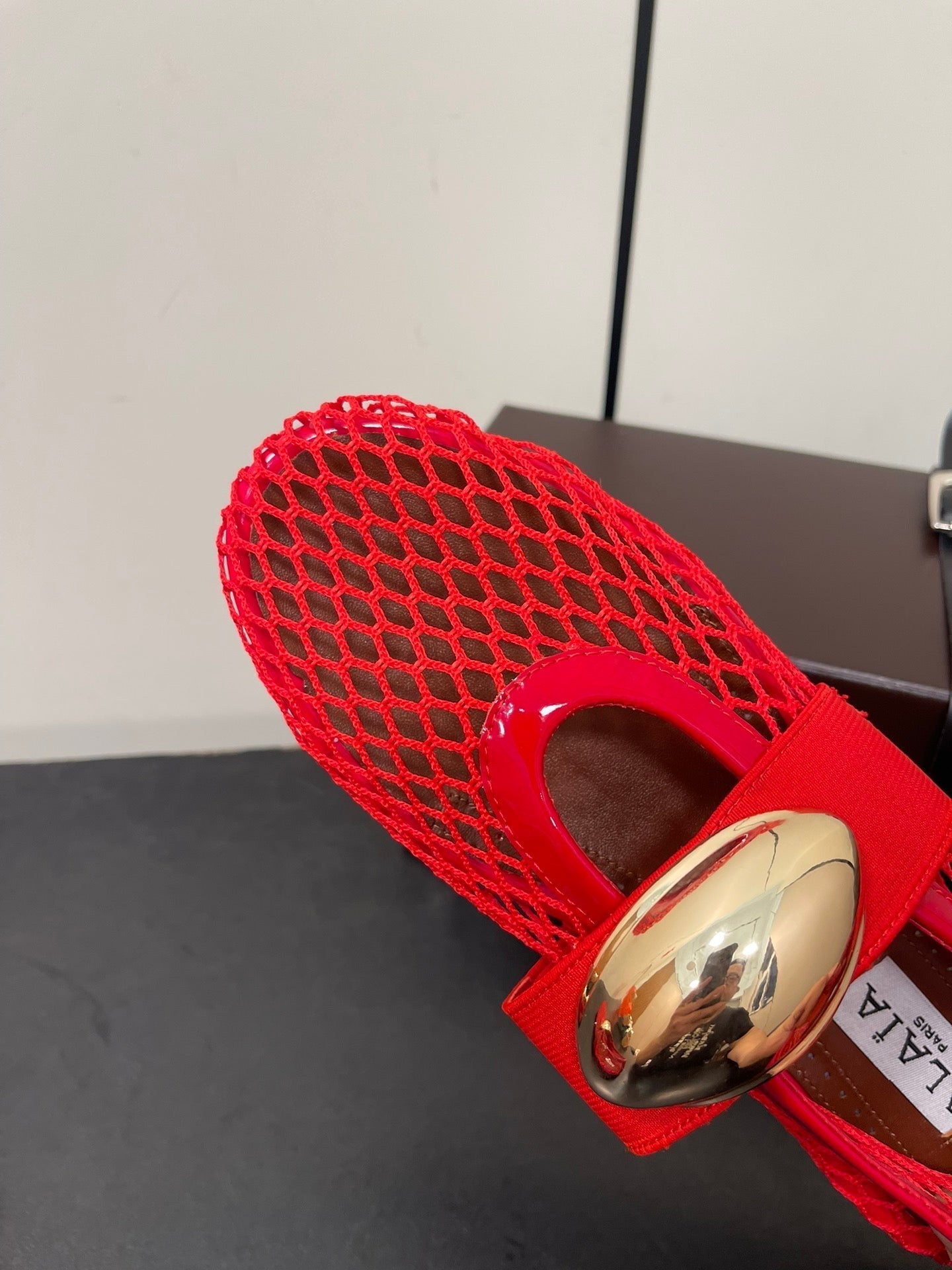 ALAIA BALLET FLATS IN CHERRY RED MESH FISHNET WITH GOLD HARDWARE