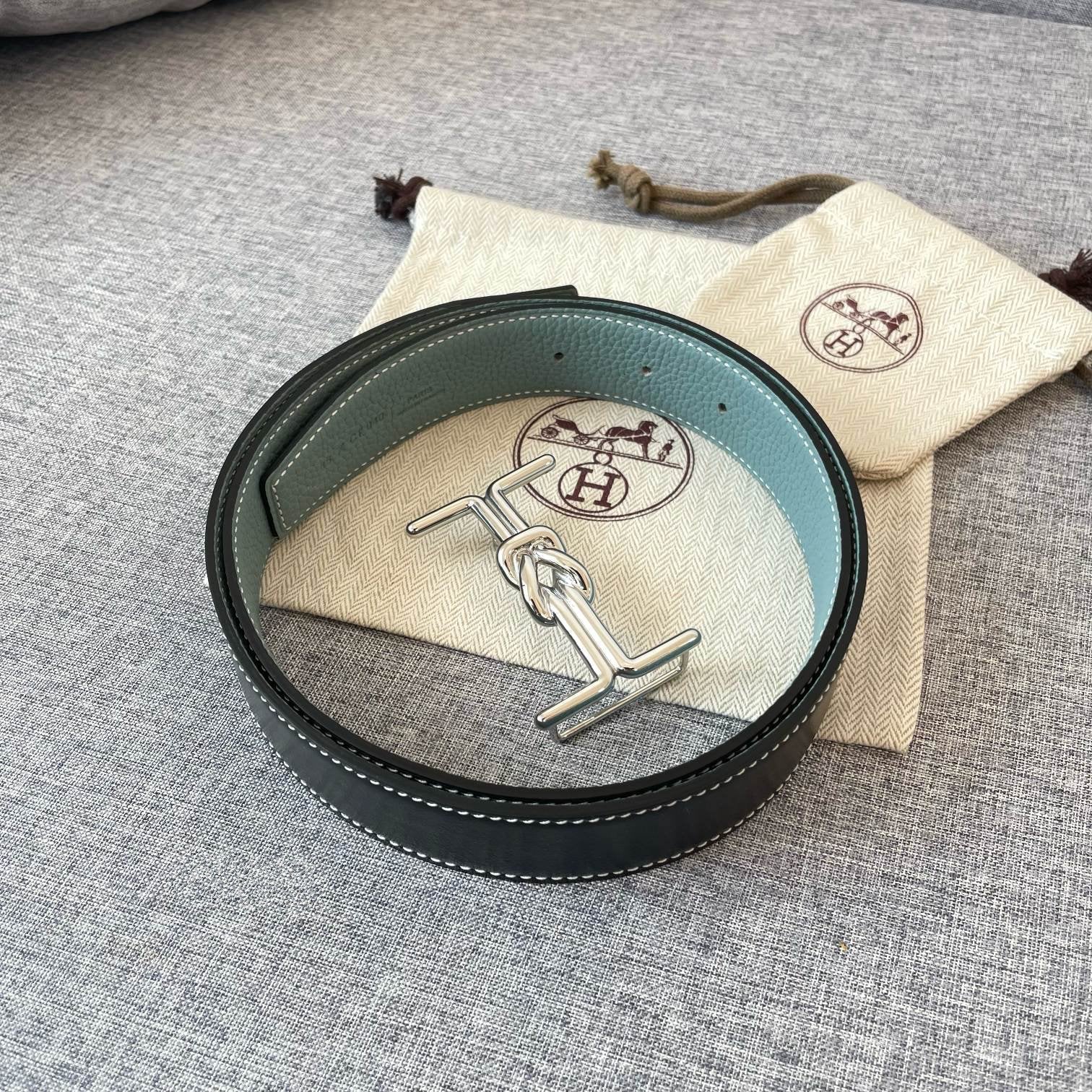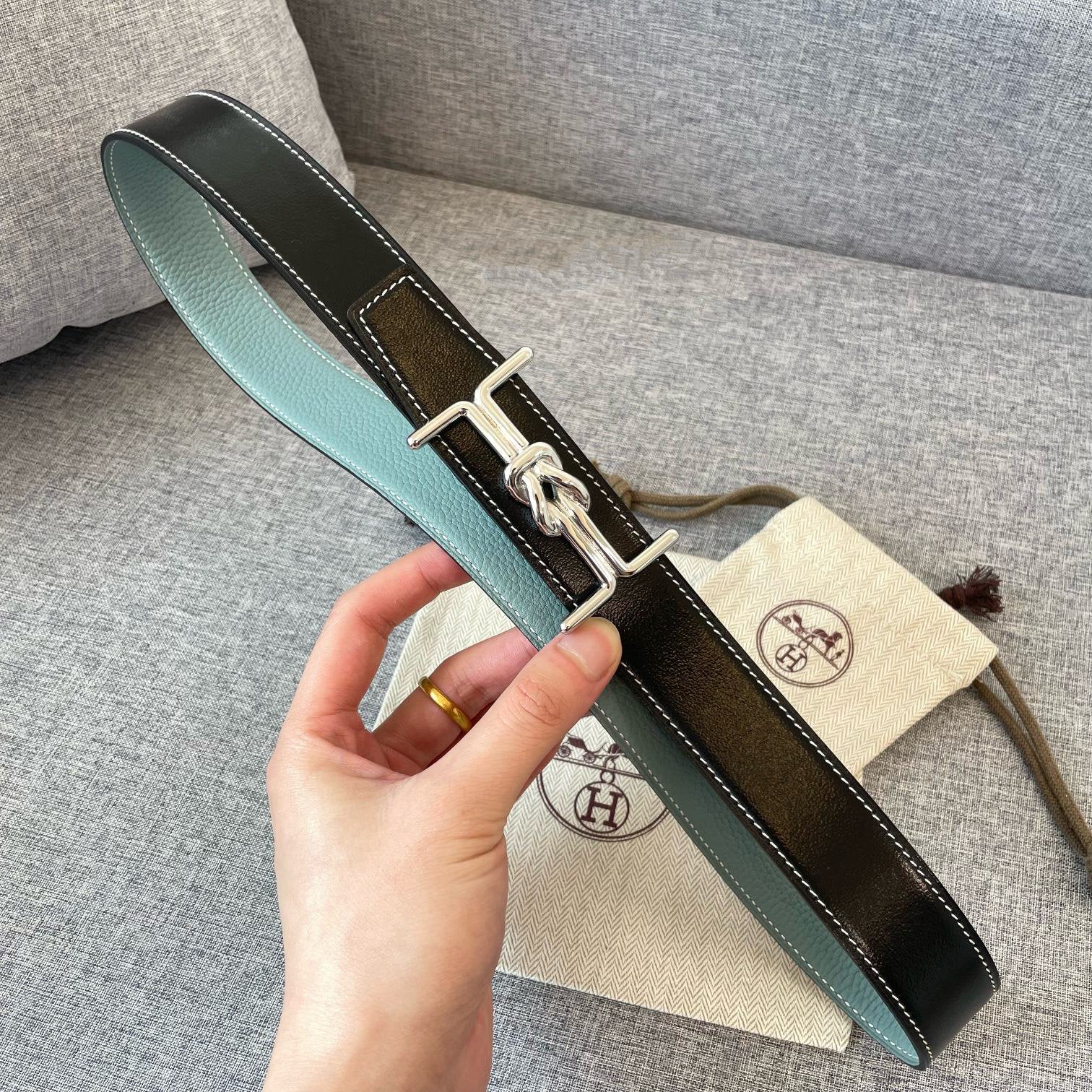 H MARIN REVERSIBLE BELT 32MM SILVER BUCKLE SKY BLUE BLACK LEATHER