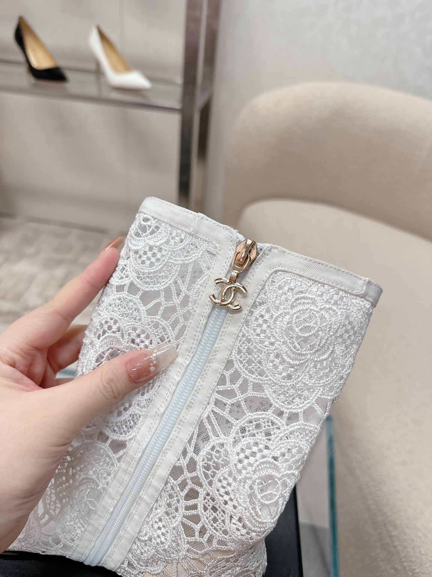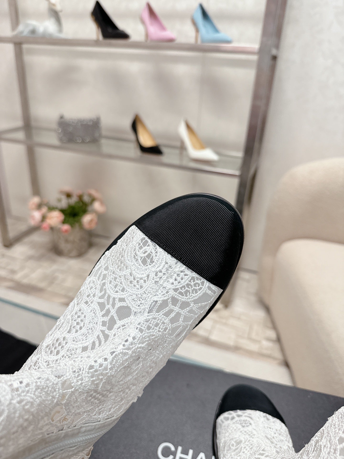 cc boots white lace fabric black grosgrain