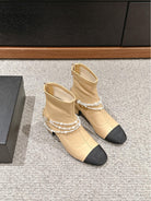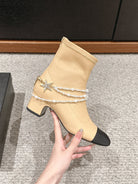 CC LOW CUT BOOTS IN SEPIA BEIGE STRETCH LAMBSKIN AND GROSGRAIN WITH PEARL CHAIN