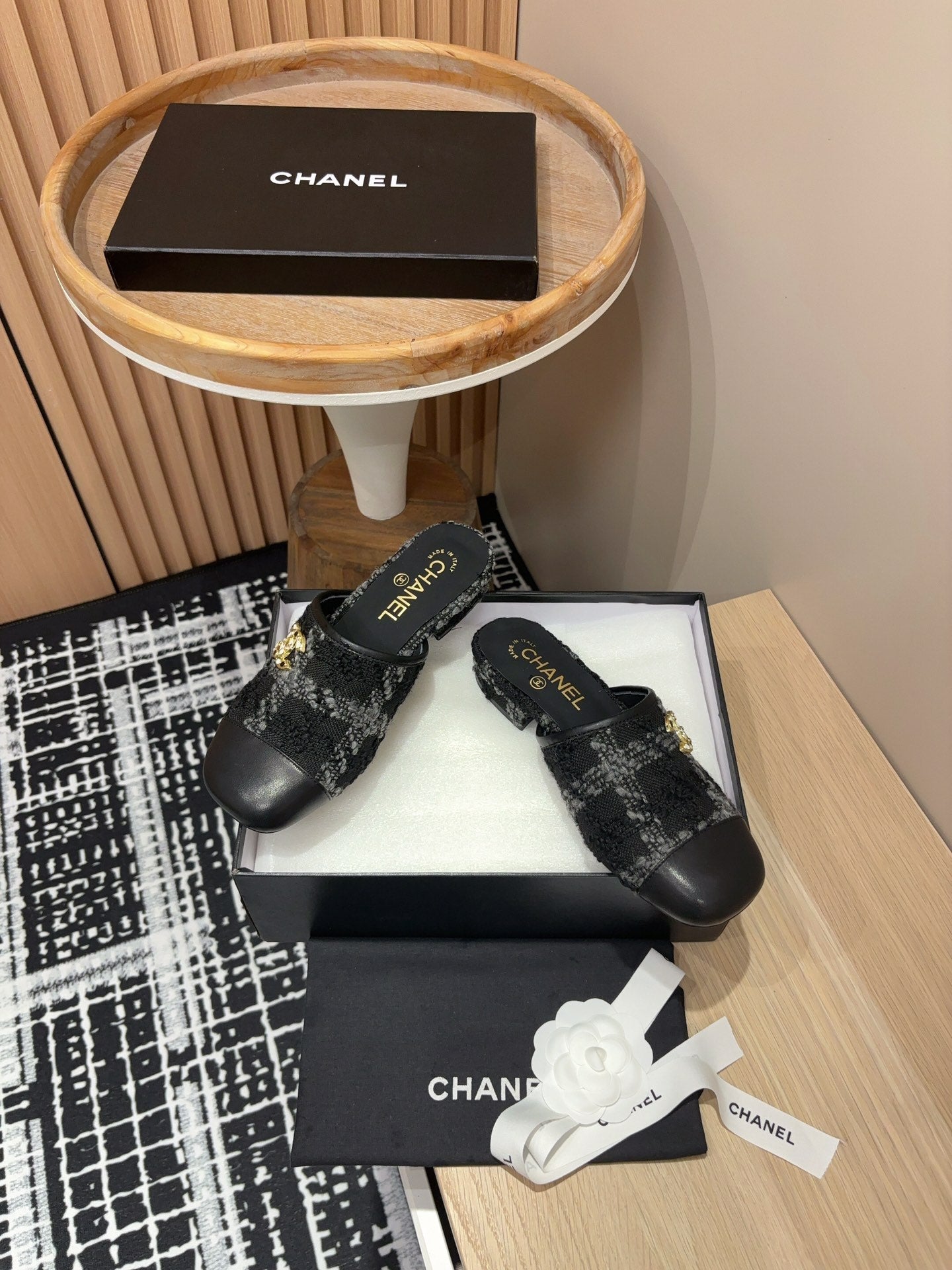 CC Mule 30mm In Black Wool Tweed And Lambskin Gold Hardware