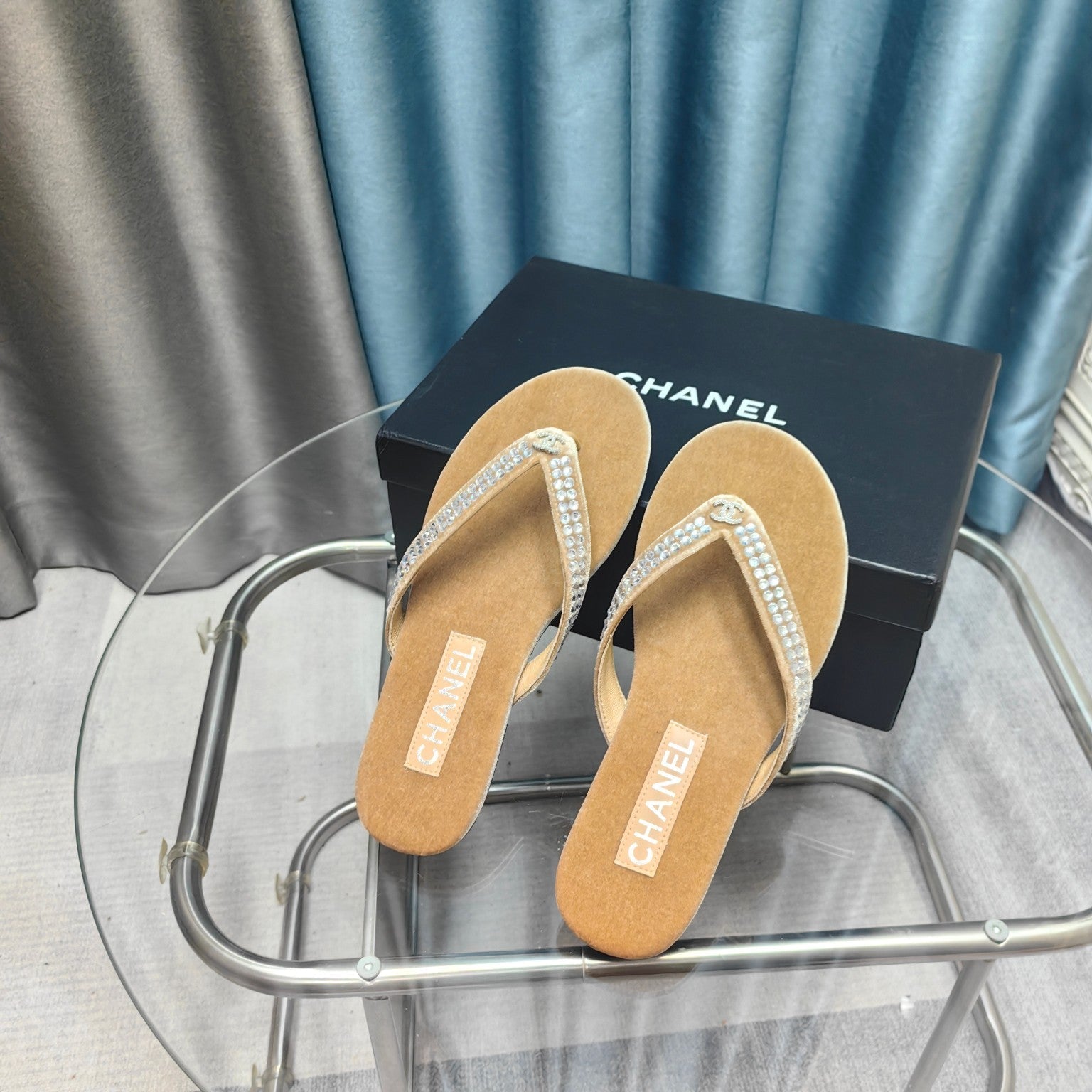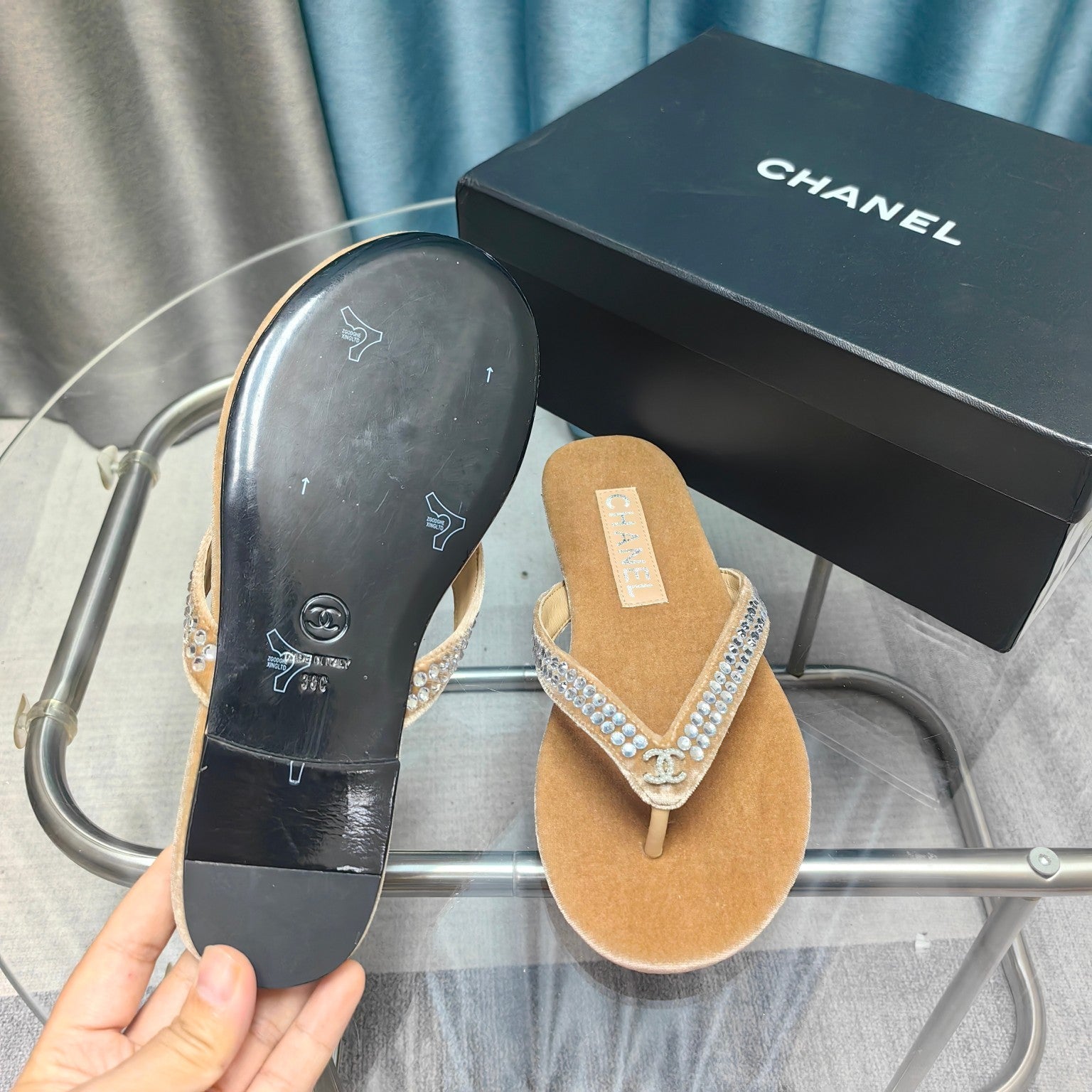 CC Thong Beige Velvet Silver Strass