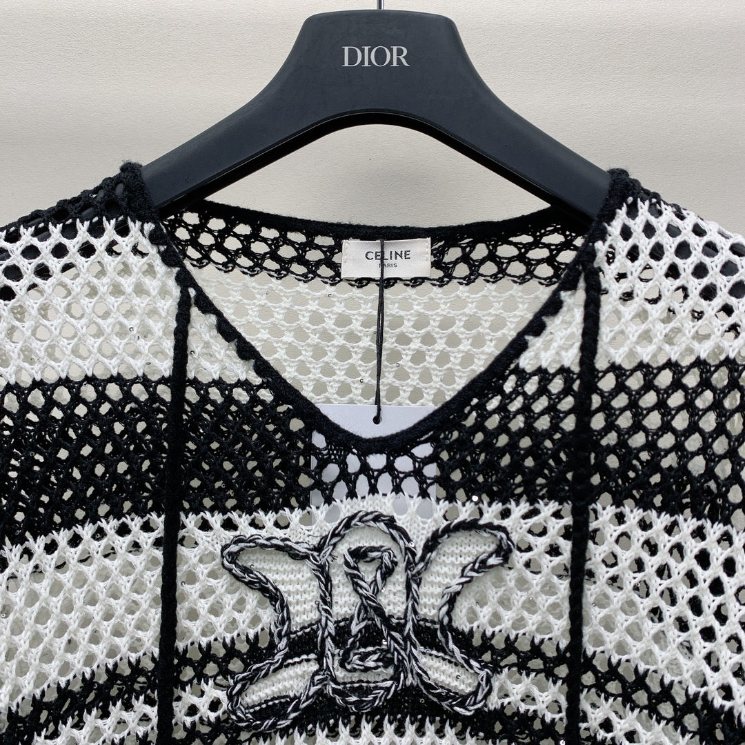 Celine 25 Hollow Crochet Cardigan Black White Wool Polyester 277568