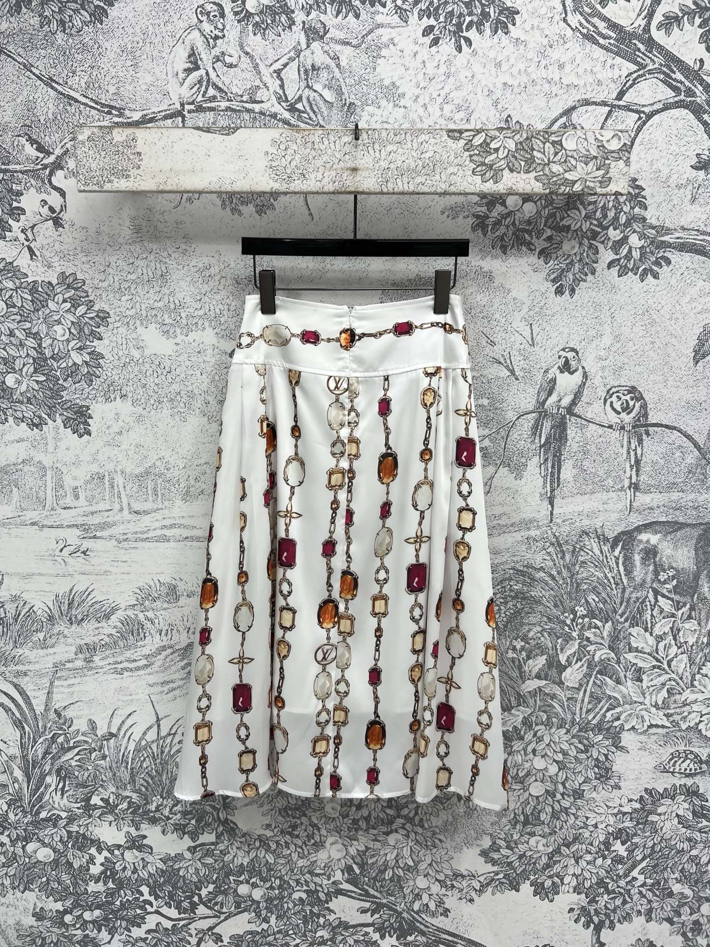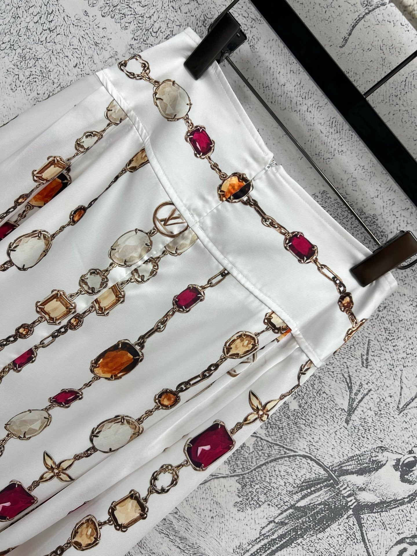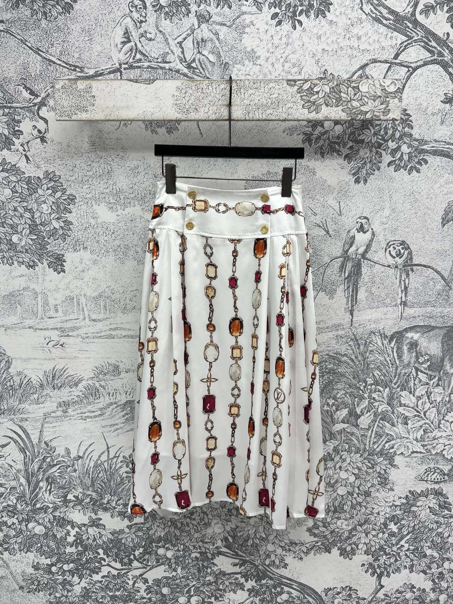 LV 25 Decorative Pattern Gemstone Chain Pleated Skirt White Poliester