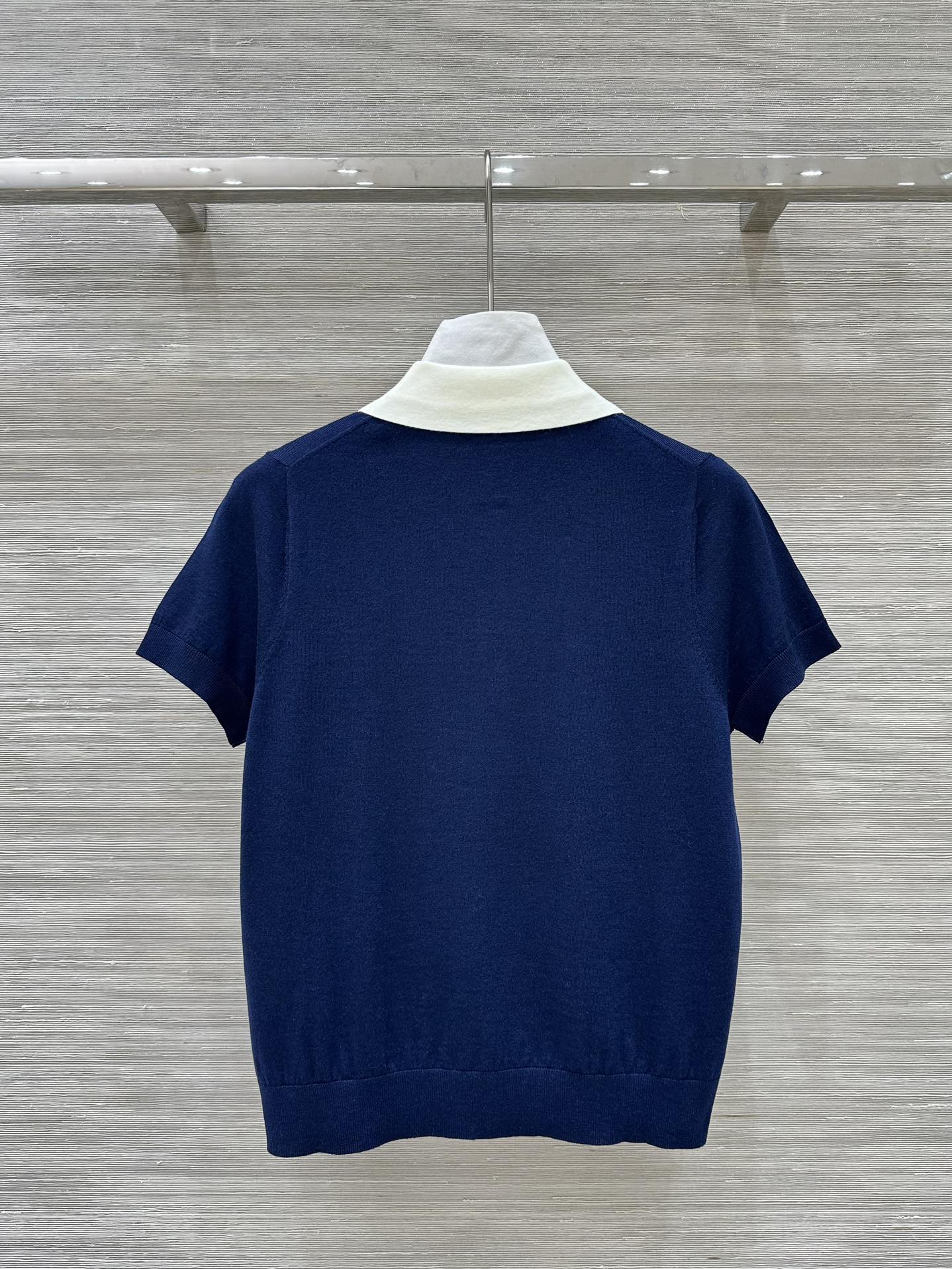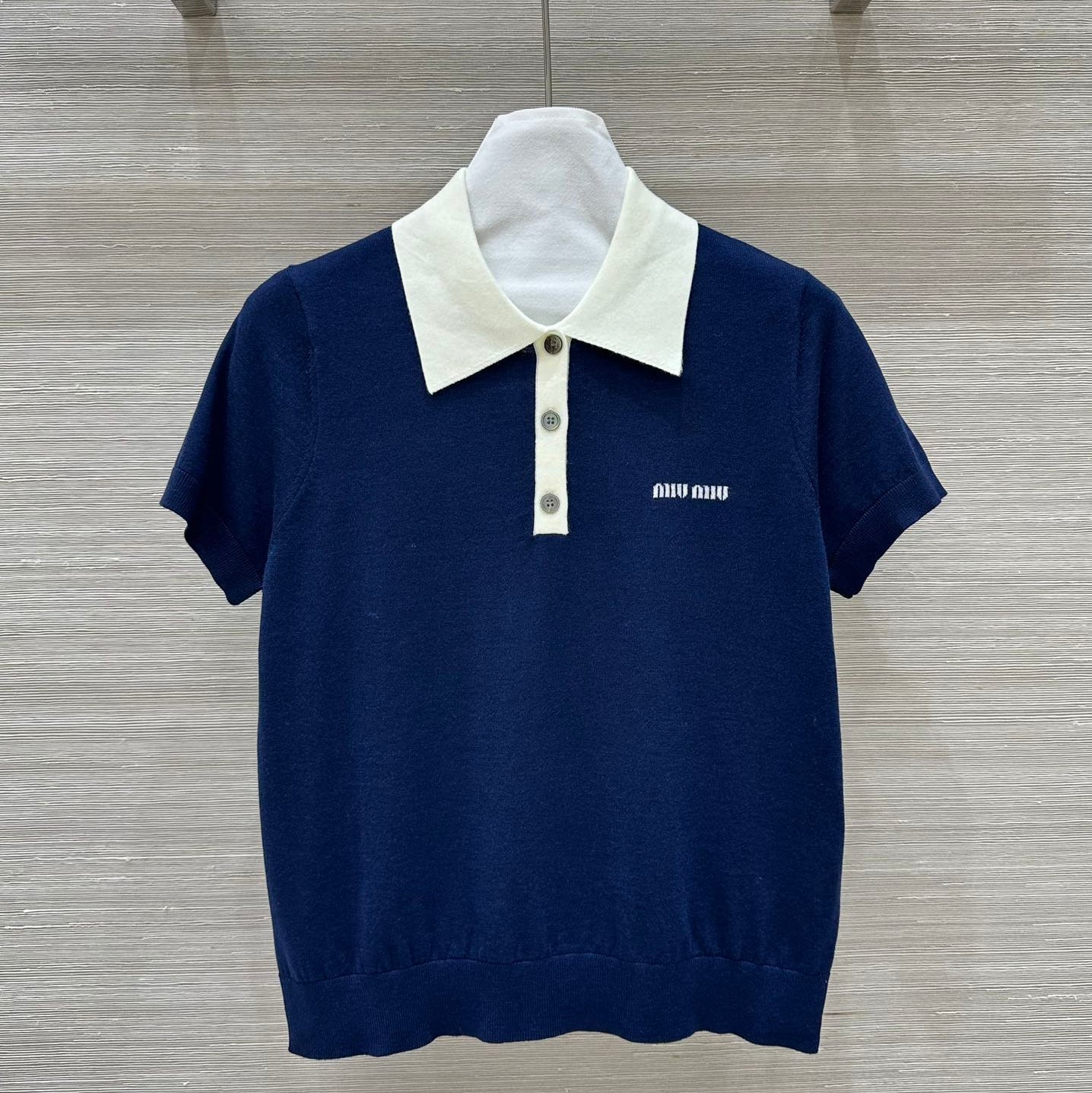 Miu Miu 25 Polo Collar Short-sleeve Knitted Top Blue Wool