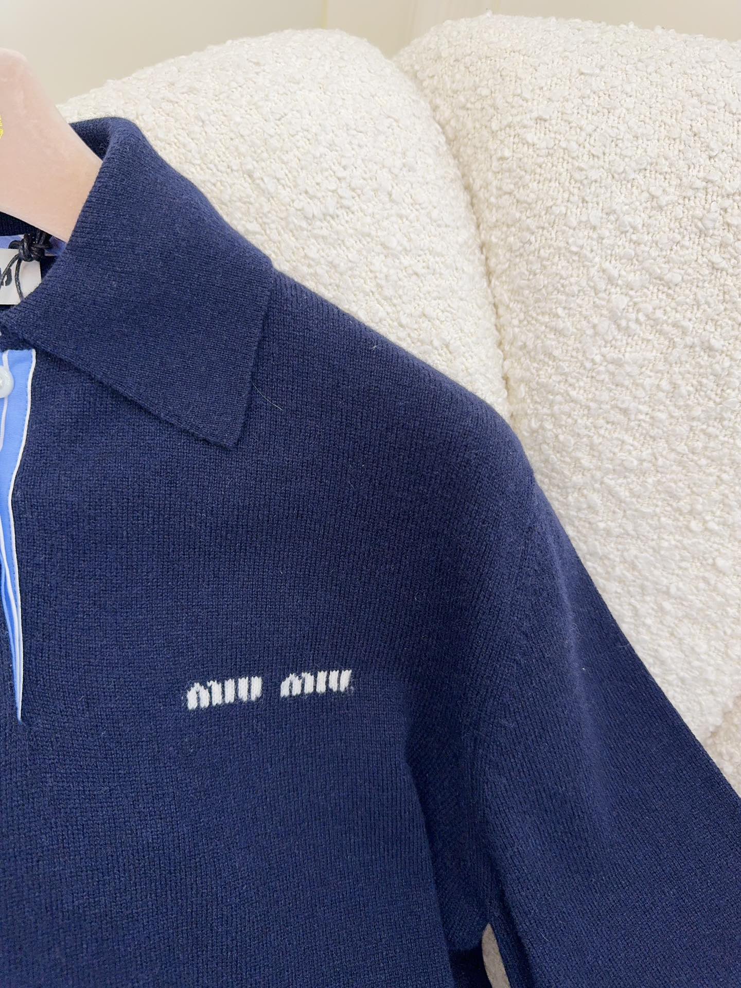 Miu Miu 25 Striped Polo Sweatshirt Dark Blue Cashmere