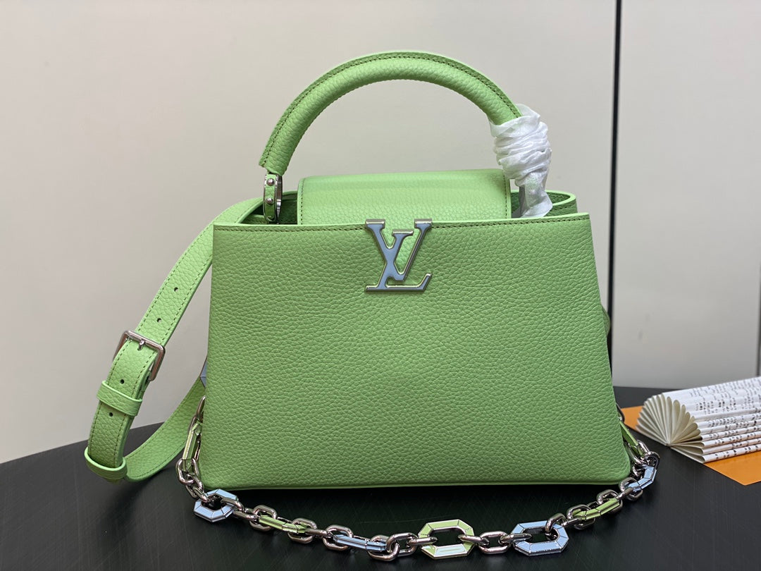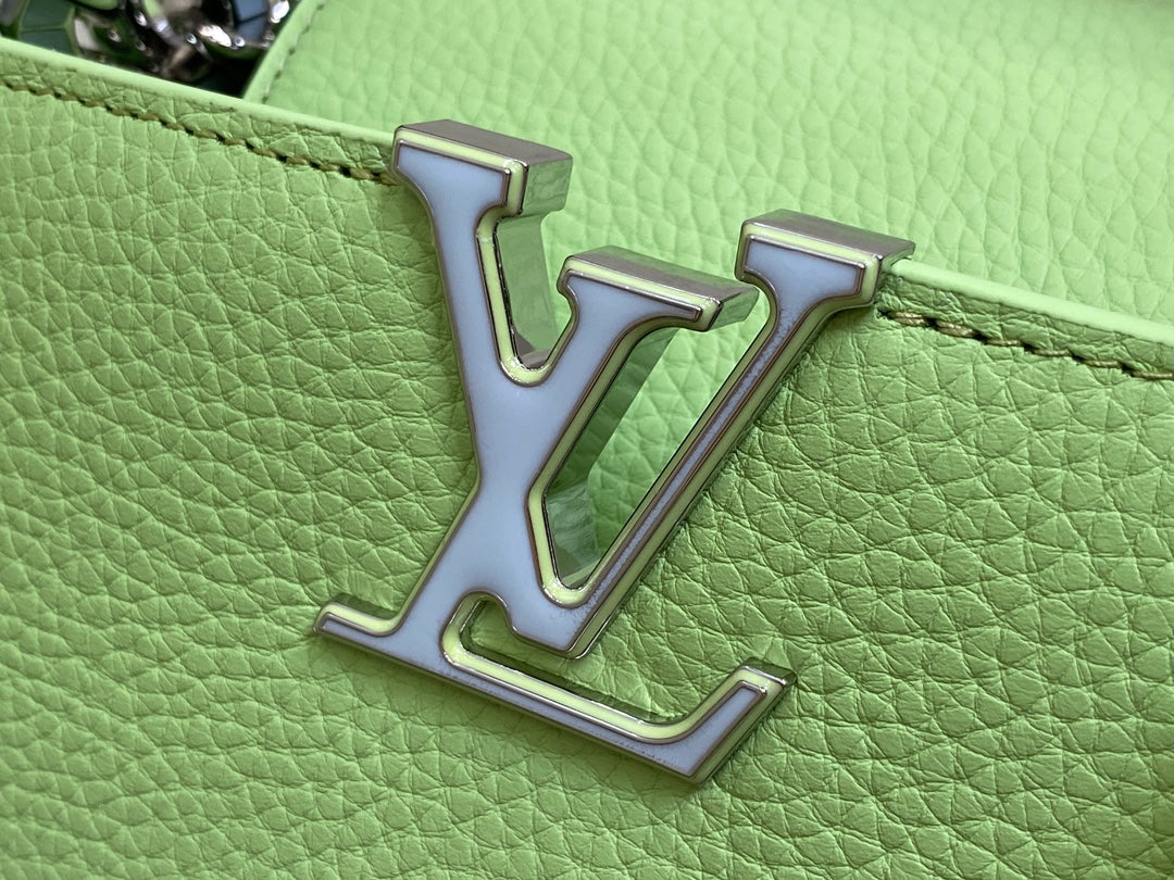 capucines mm 31.5 green taurillon leather turquoise silver hardware