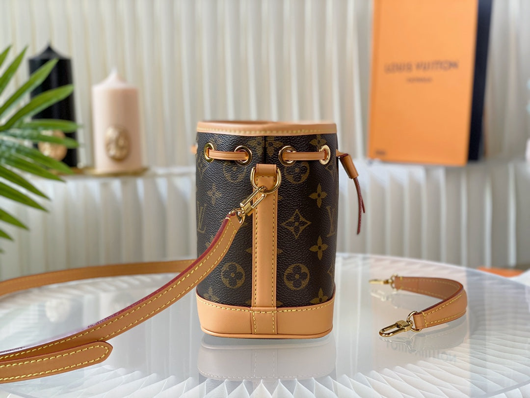 nano noe 13 brown monogram canvas beige calfskin gold hardware