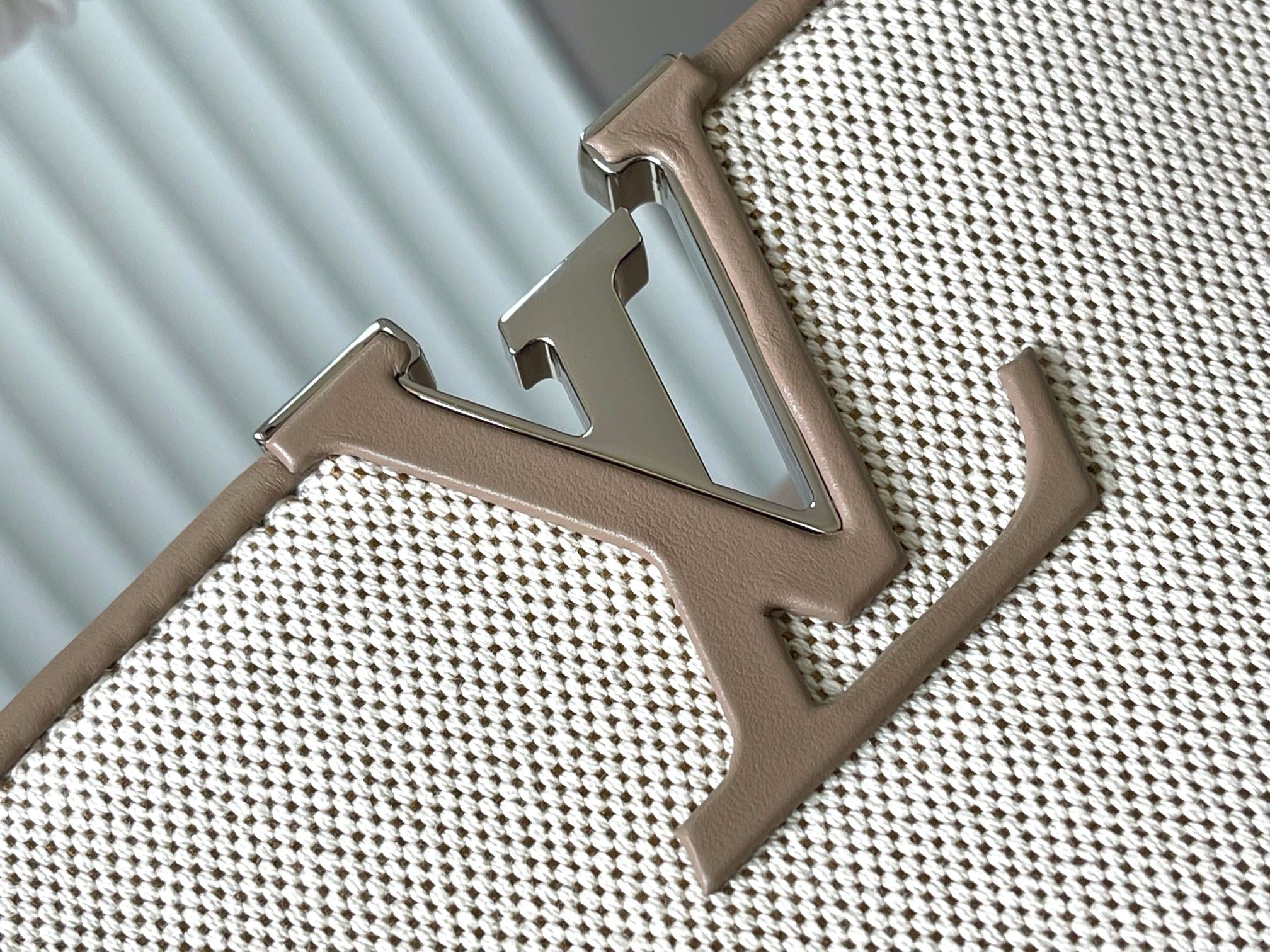 CAPUCINES GM 38CM BEIGE CANVAS BROWN CALFSKIN