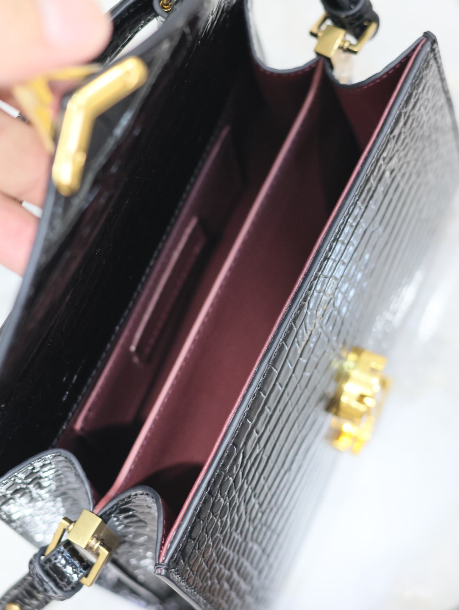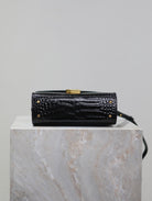 CASSANDRA MINI TOP HANDLE BAG 20 IN BLACK CROCODILE-EMBOSSED GLOSSY CALFSKIN