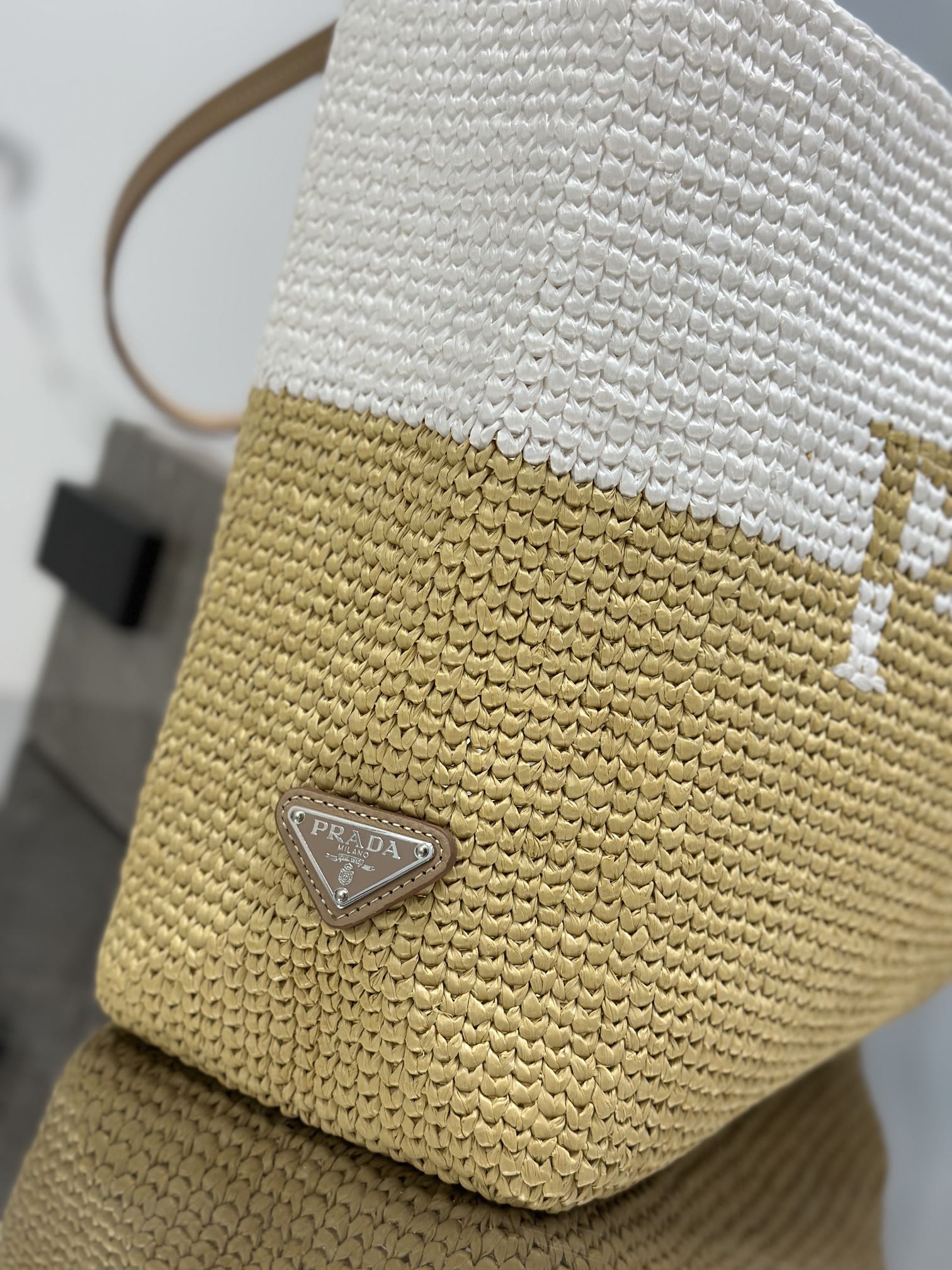 LARGE TOTE BAG 37 IN WHITE MIX BEIGE RAFFIA AND BROWN CALFSKIN HANDLE