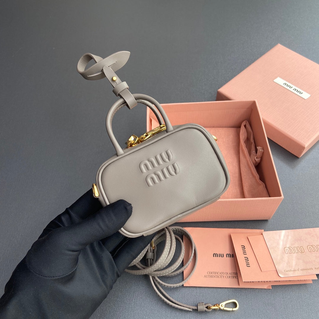 MICRO BAG KEYCHAIN 11 IN CLAY GREY CALFSKIN GOLD HARDWARE EMBOSSED LOGO