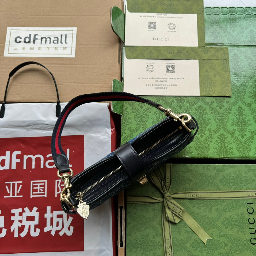 MOON SIDE SHOULDER BAG 24 IN BLUE EMBOSSED DENIM AND BLACK CALFSKIN TRIM GOLD HARDWARE