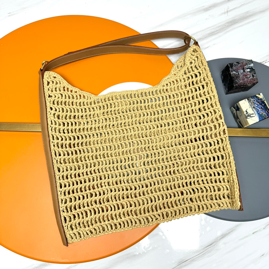 YSL OXALIS 37CM BEIGE RAFFIA TAN CALFSKIN