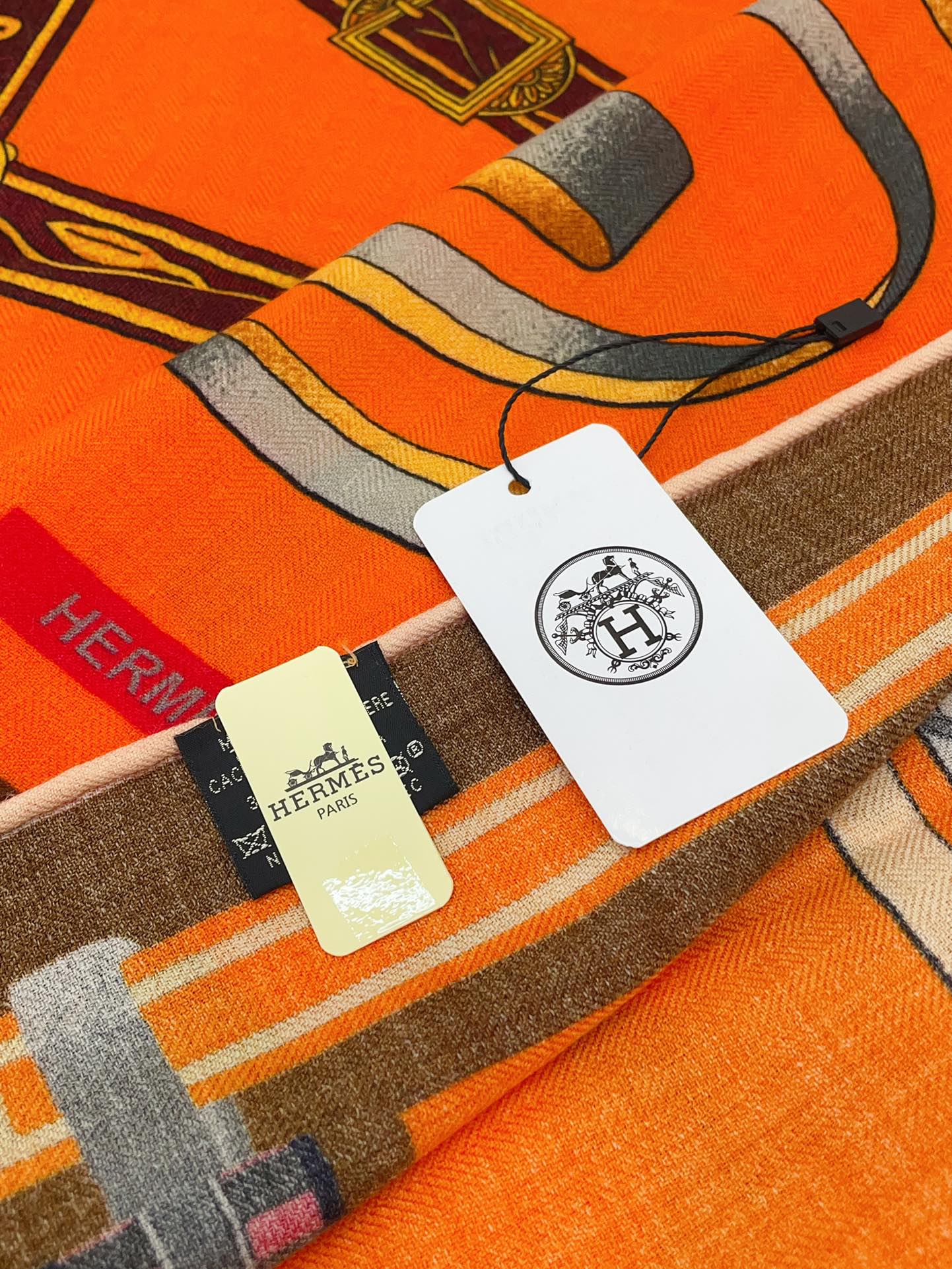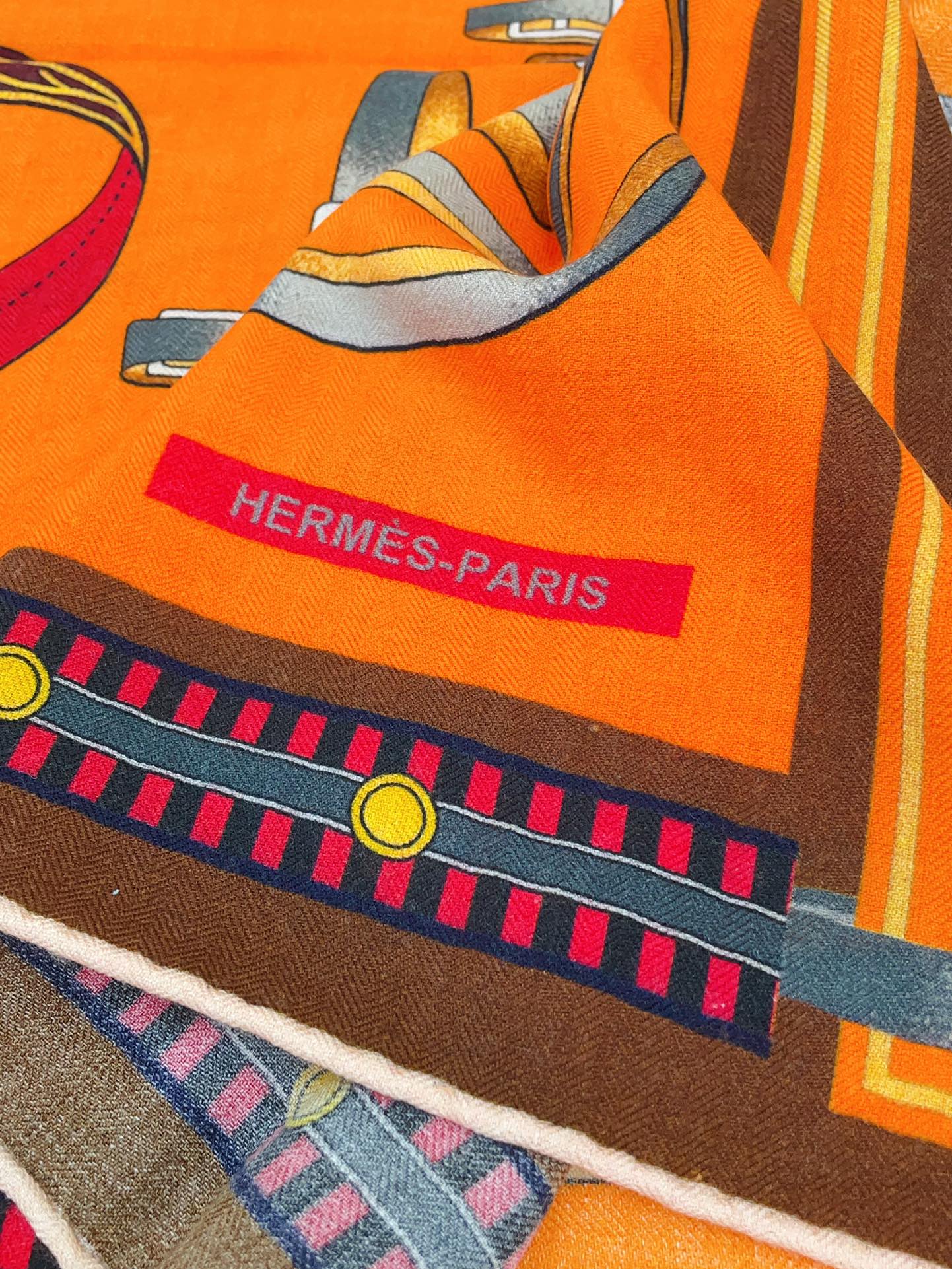 HM Lettres Equestre Scarf 140 CM In Orange Brown Colorful Cashmere And Silk 359400