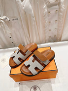 CHYPRE SANDAL BRIGHT BROWN LAMBSKIN AND SILVER DENIM