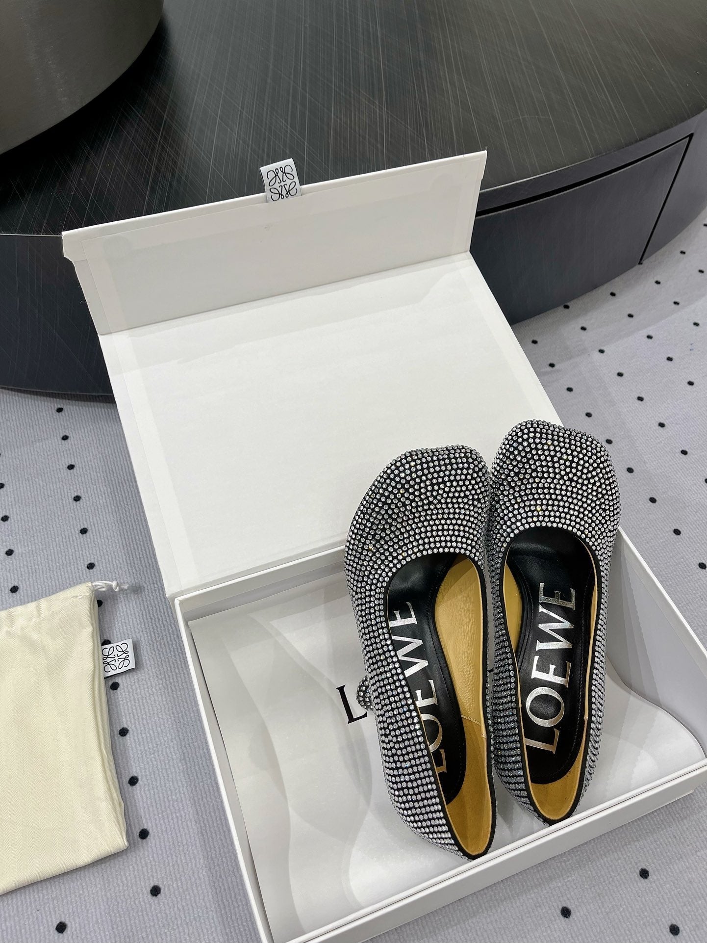 - Material: suede and allover rhinestones