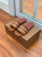 Suitcase Stripe Flat Sandals Brown Maroon Leather