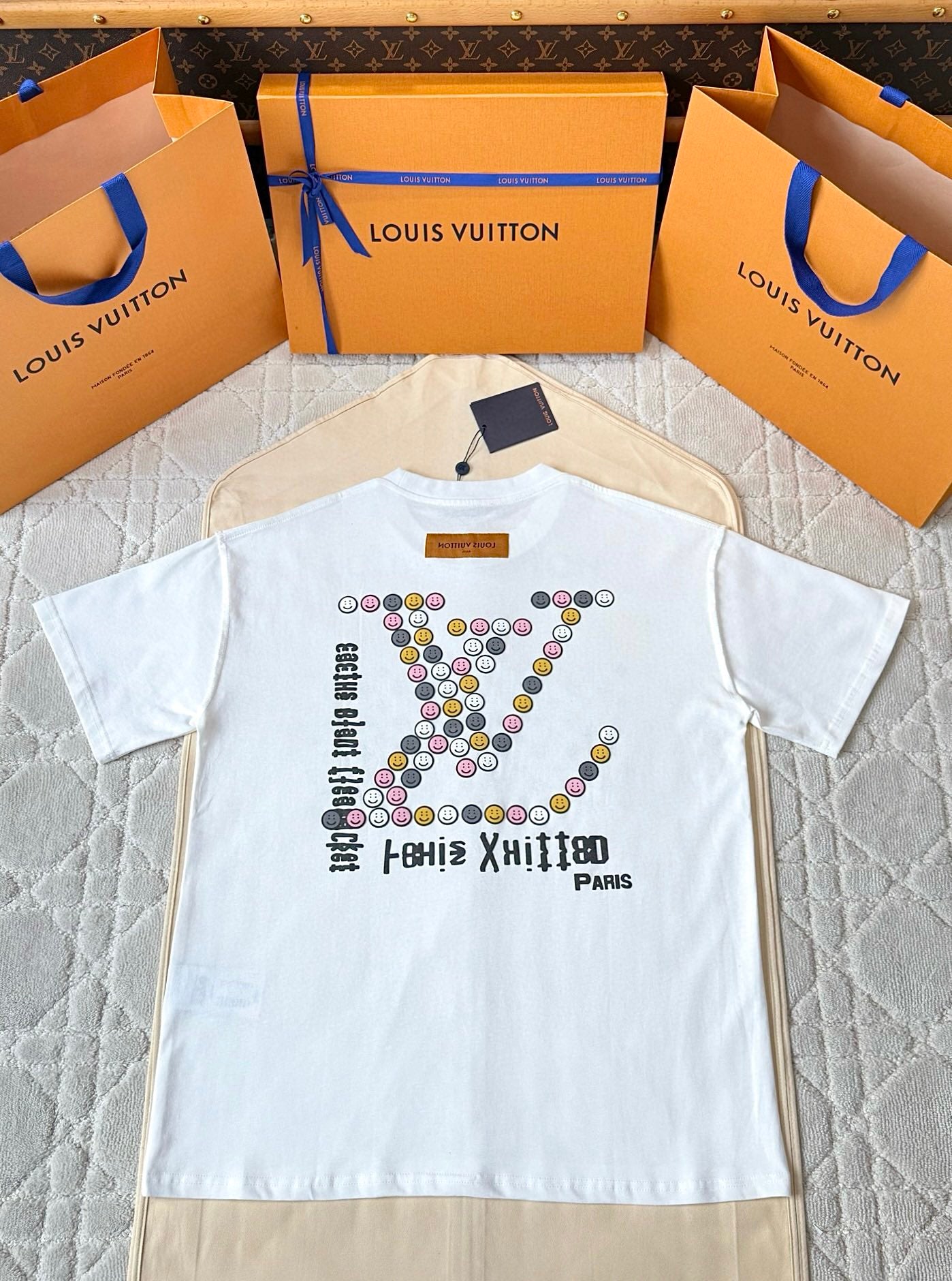 LV 25 Rainbow Smiley Face Print Short Sleeves Shirt White Cotton