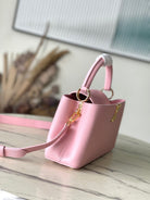CAPUCINES EAST-WEST 33 IN BLUSH PINK CALFSKIN GOLD HARDWARE