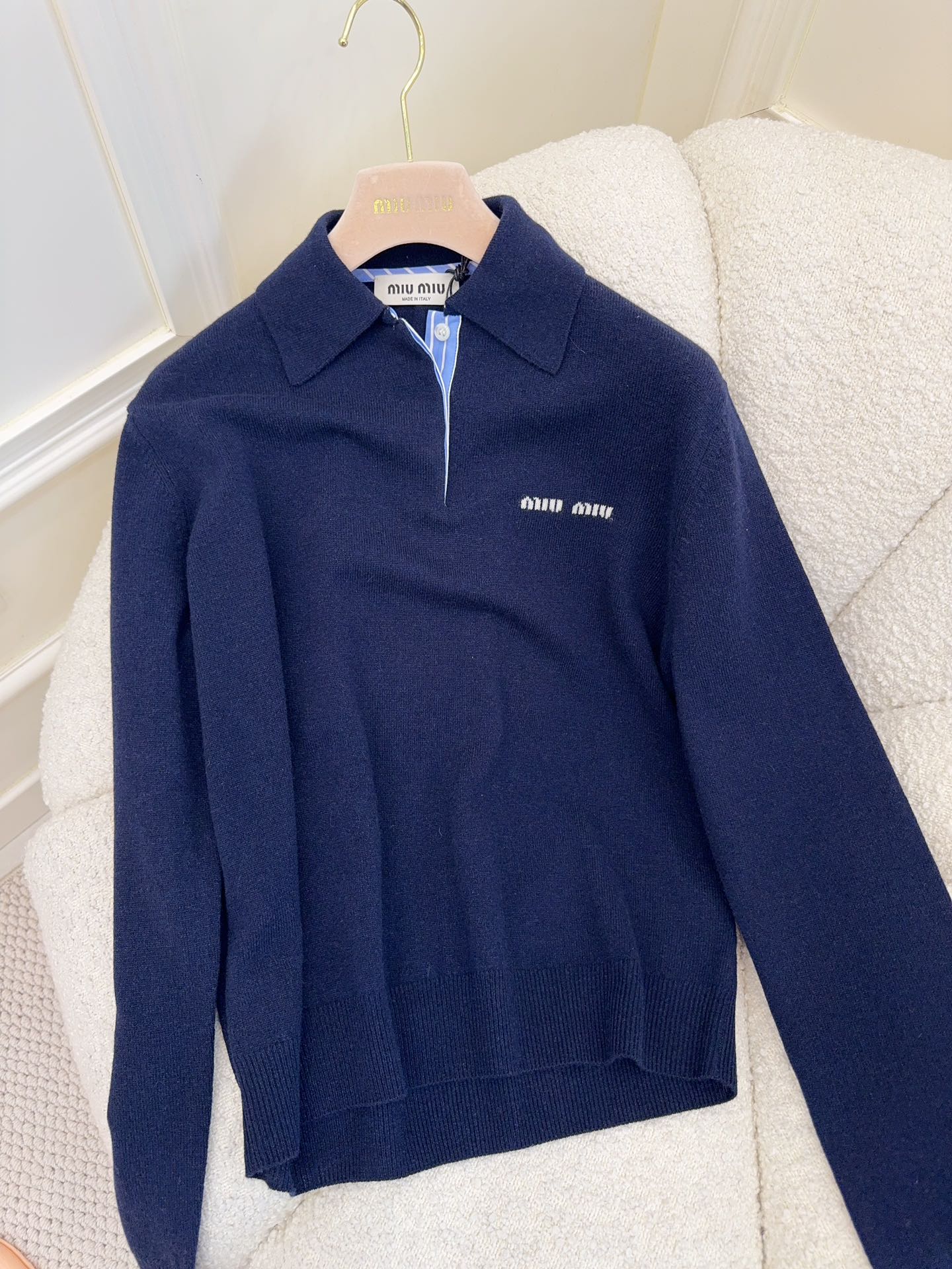 Miu Miu 25 Striped Polo Sweatshirt Dark Blue Cashmere