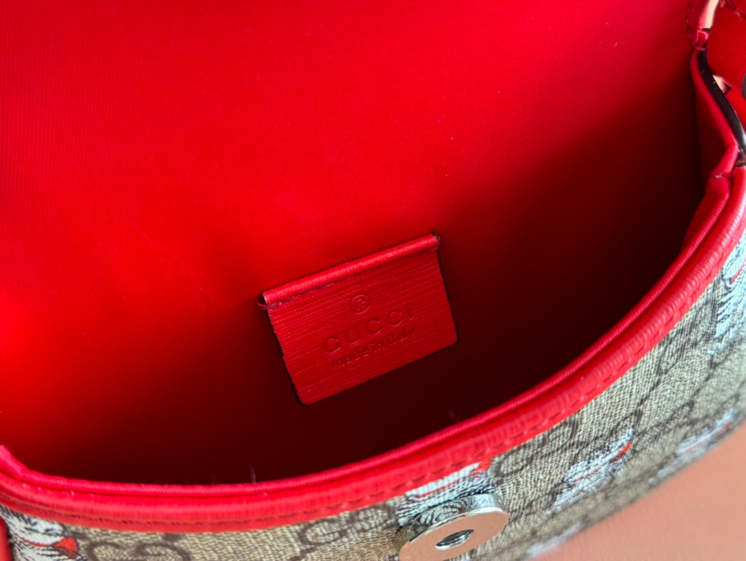 Gucci Cat Print Shoulder Bag White Red Beige Canvas 239660