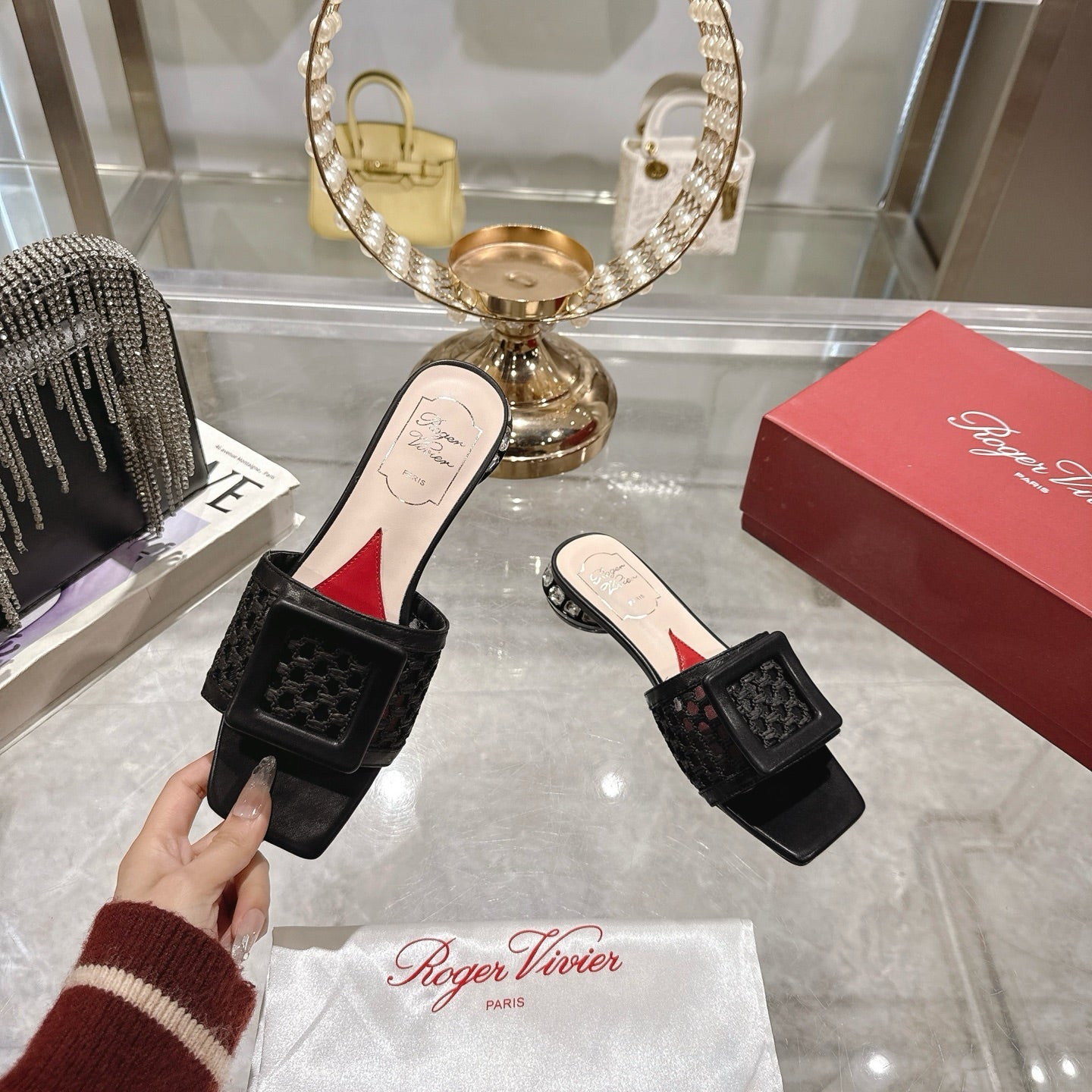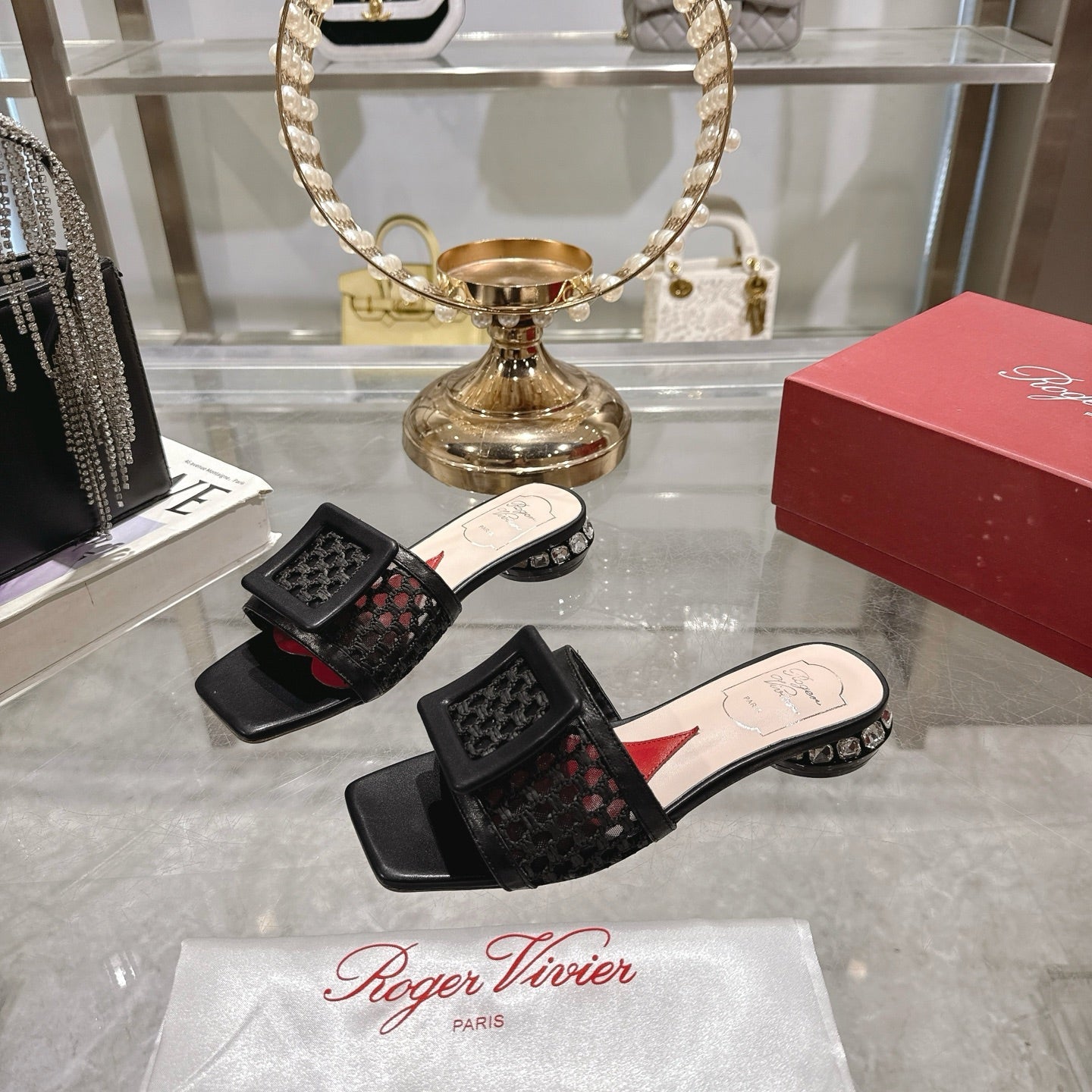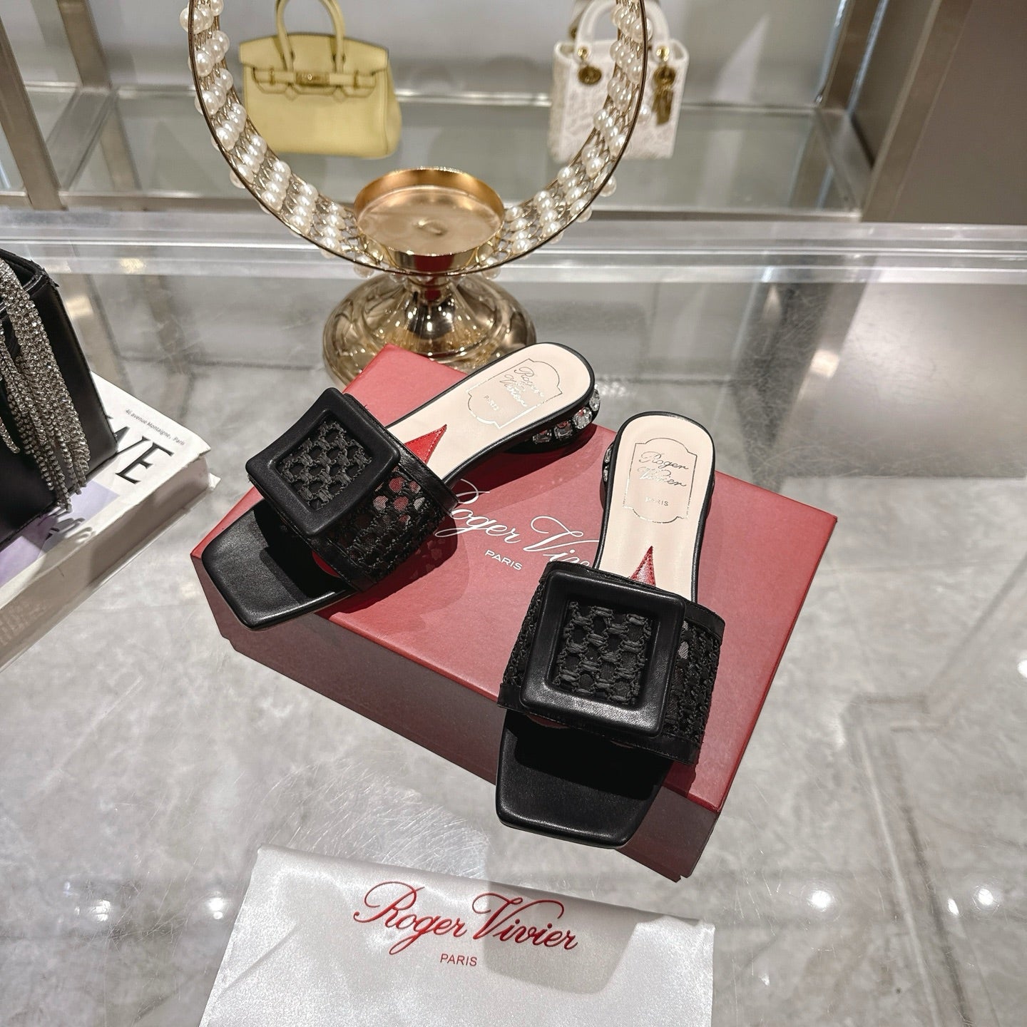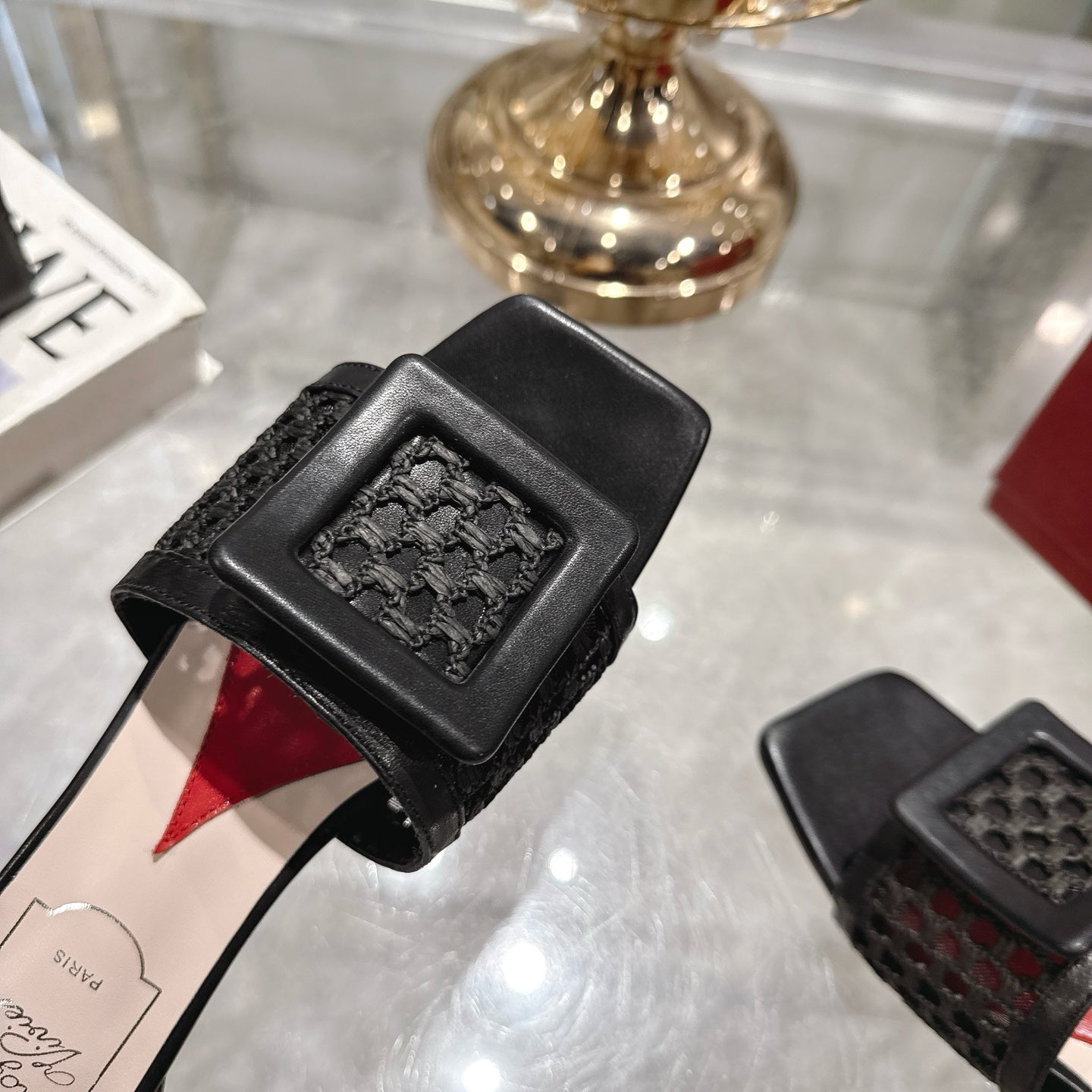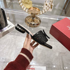 Viv 25 Hollow Square Buckle Slippers Black Weaving Leather 262999