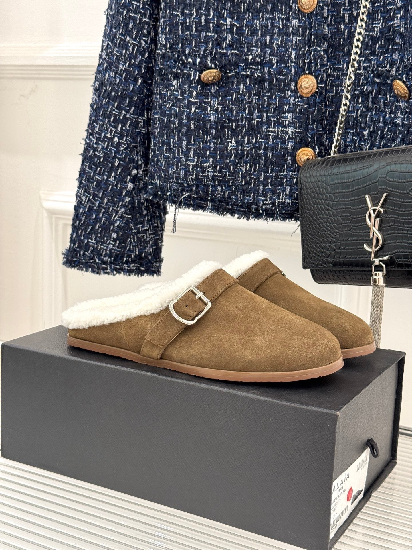 Alaia 25WF slippers belt buckle khaki brown suede wool 472227