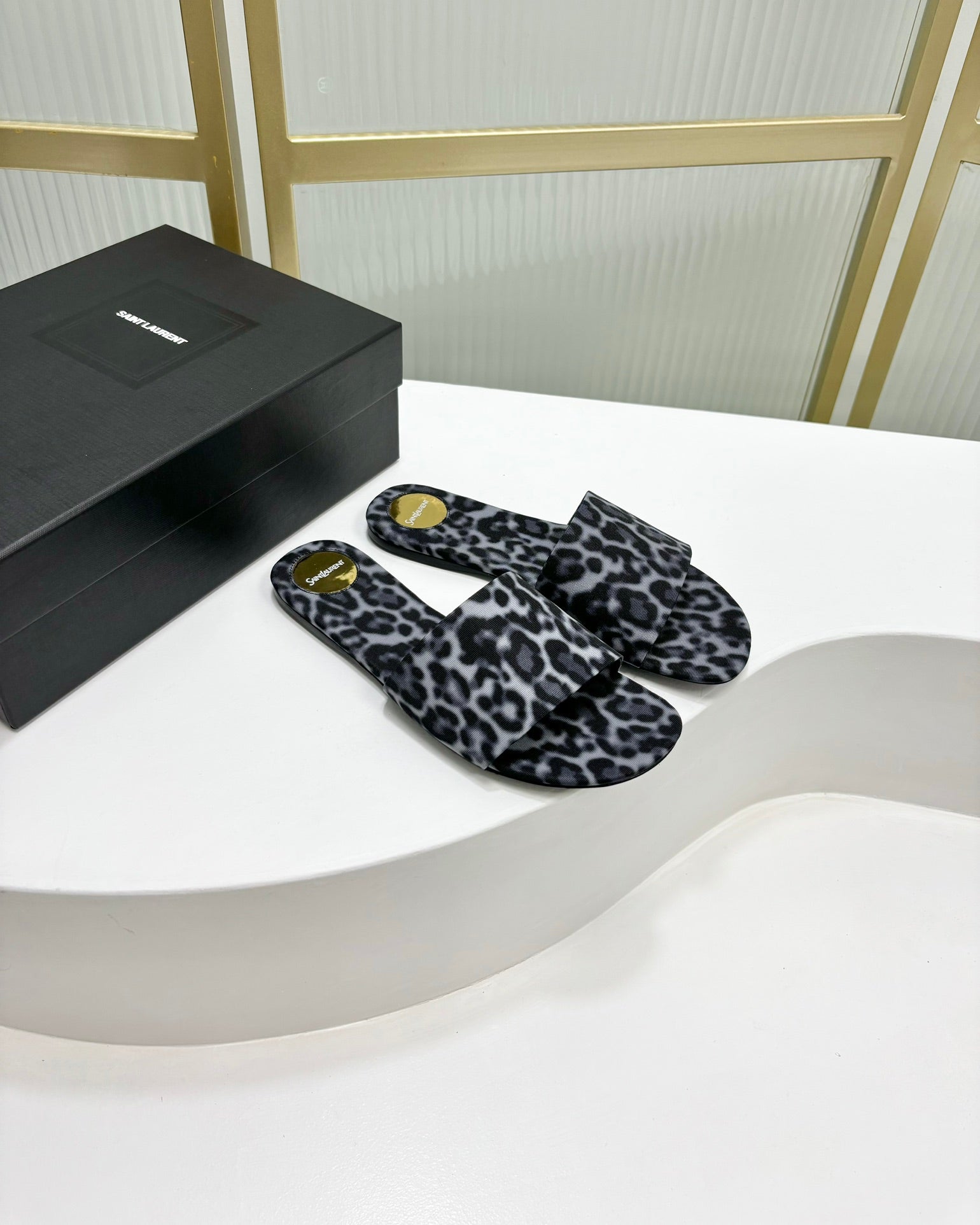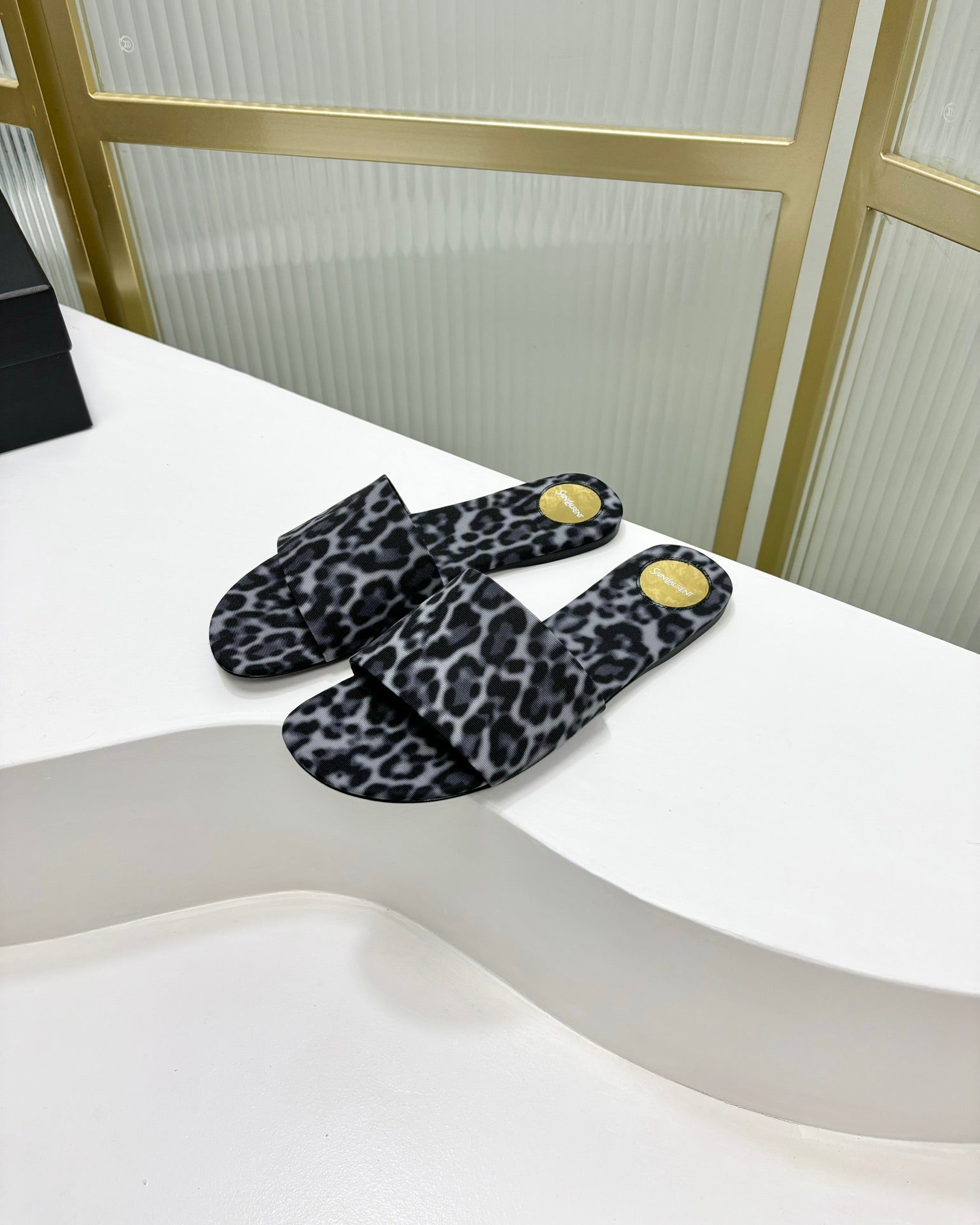 CARLYLE SLIDES IN LEOPARD GROSGRAIN BLACK WHITE