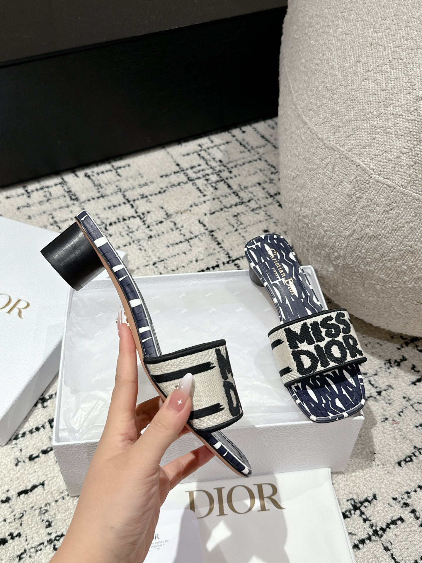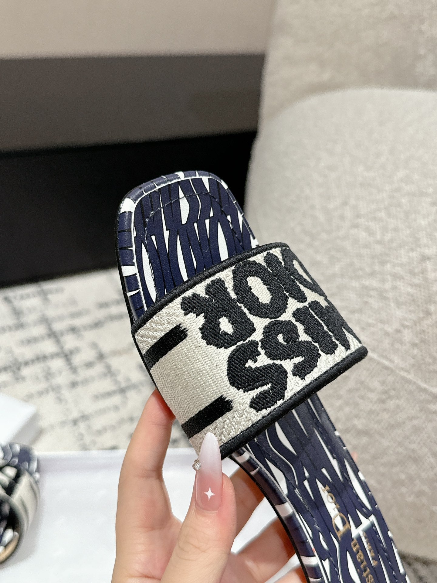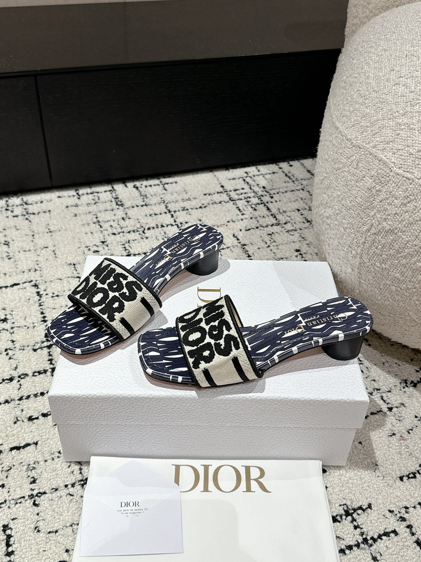 CD Dway Heeled Slide Deep Blue Mix Black White Embroidered Cotton