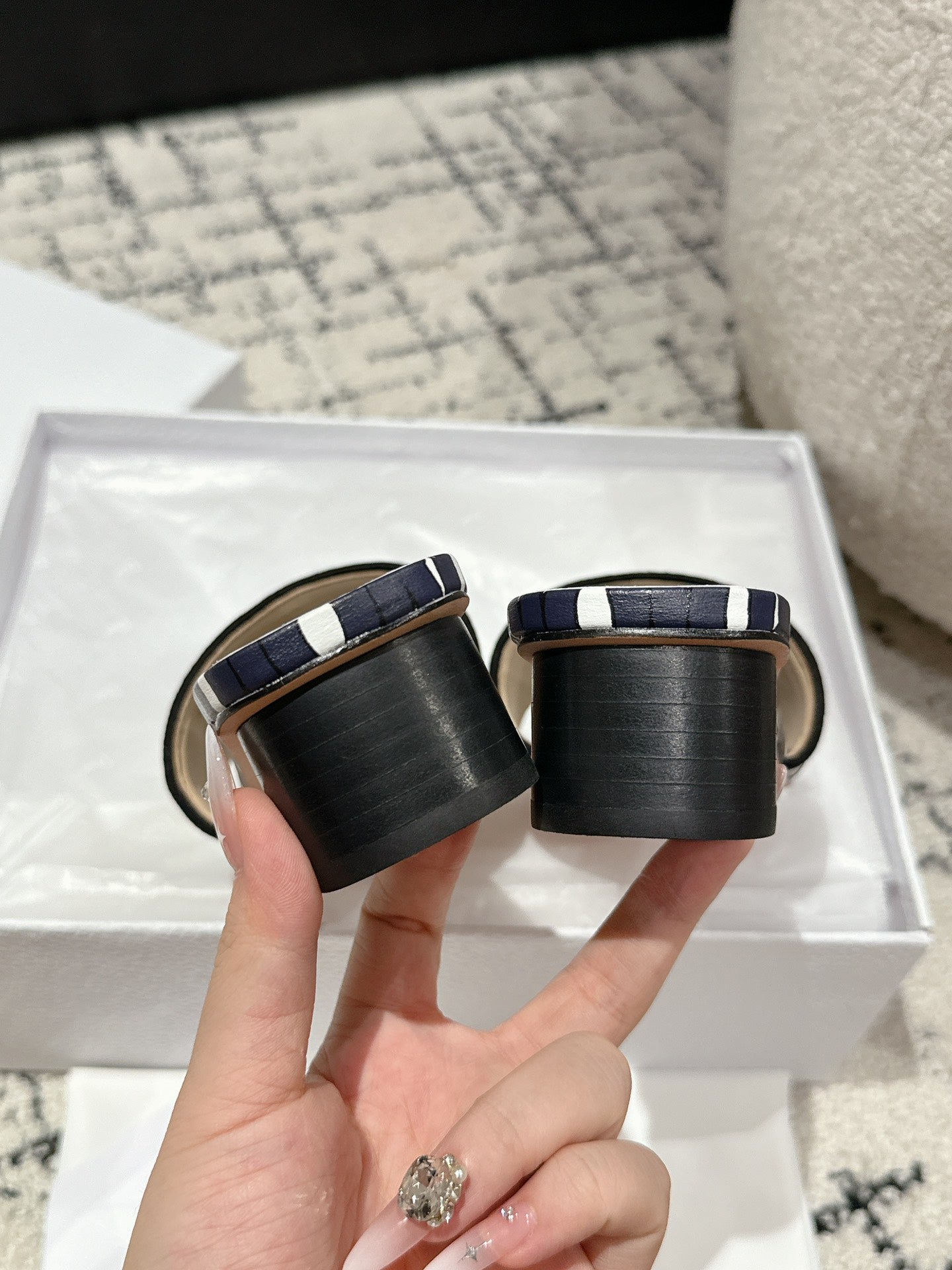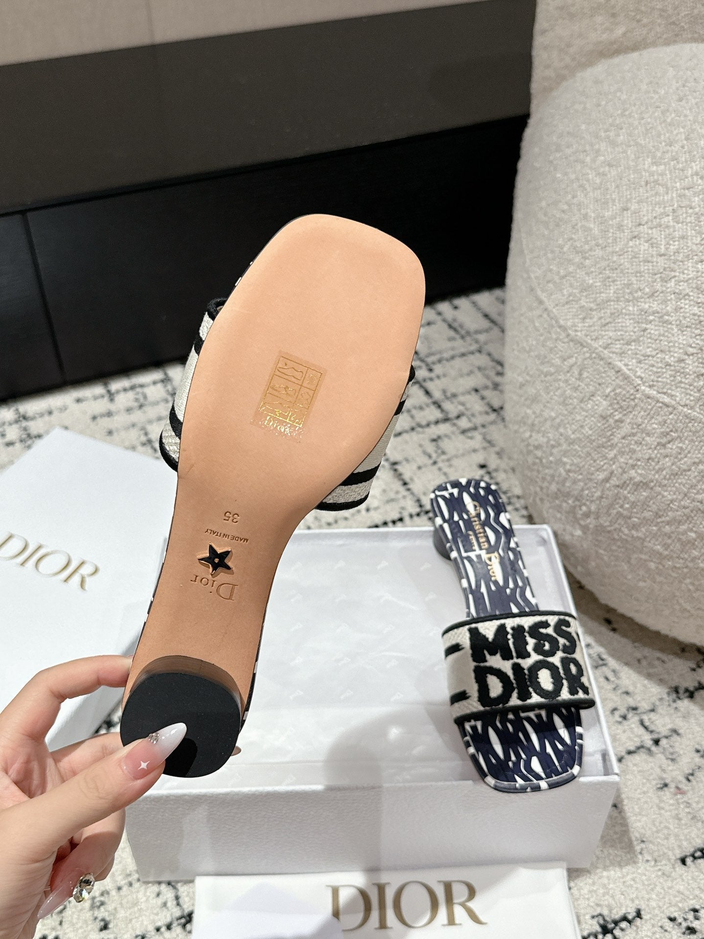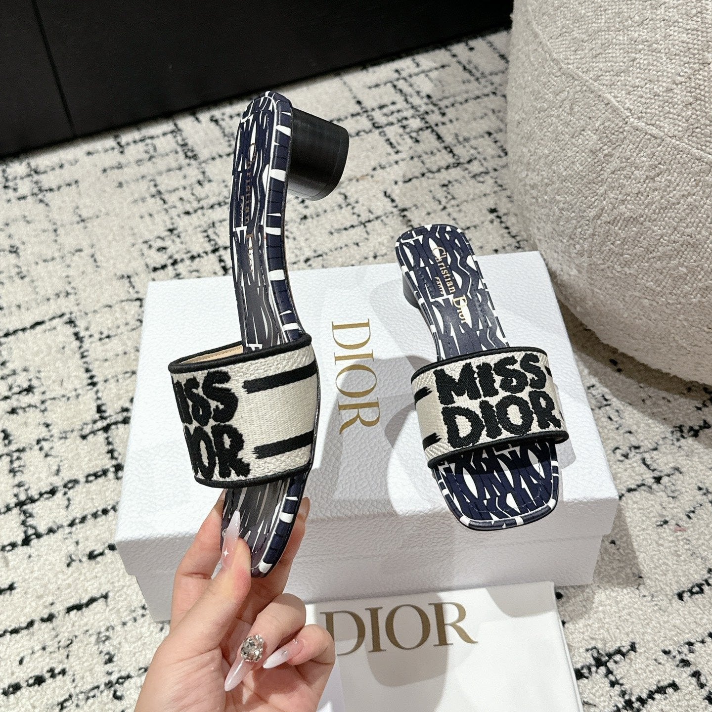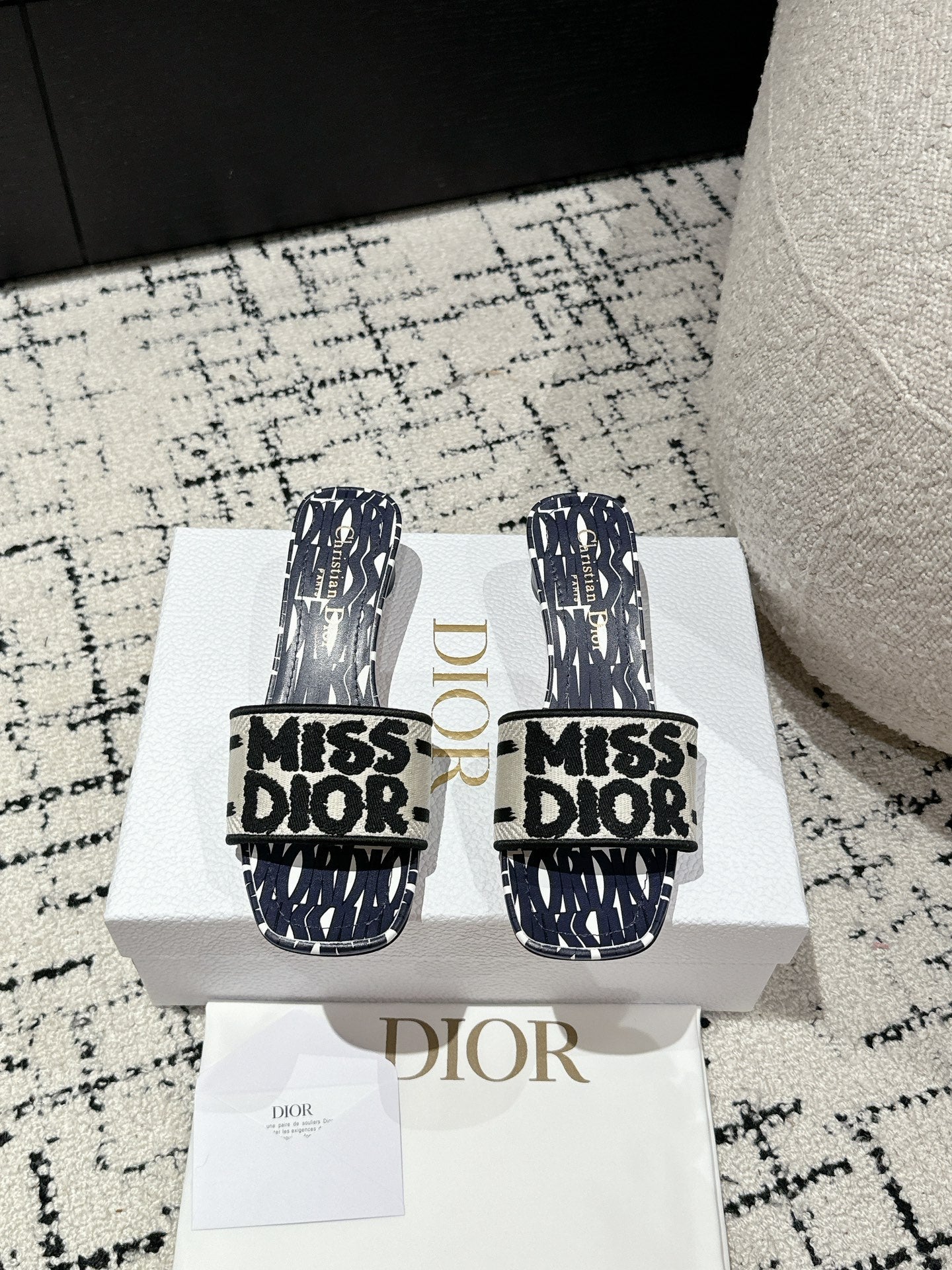 CD Dway Heeled Slide Deep Blue Mix Black White Embroidered Cotton