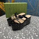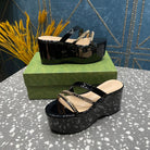 HIGH WEDGE PLATFORM IN BLACK CALFSKIN WITH GOLD HARDWARE