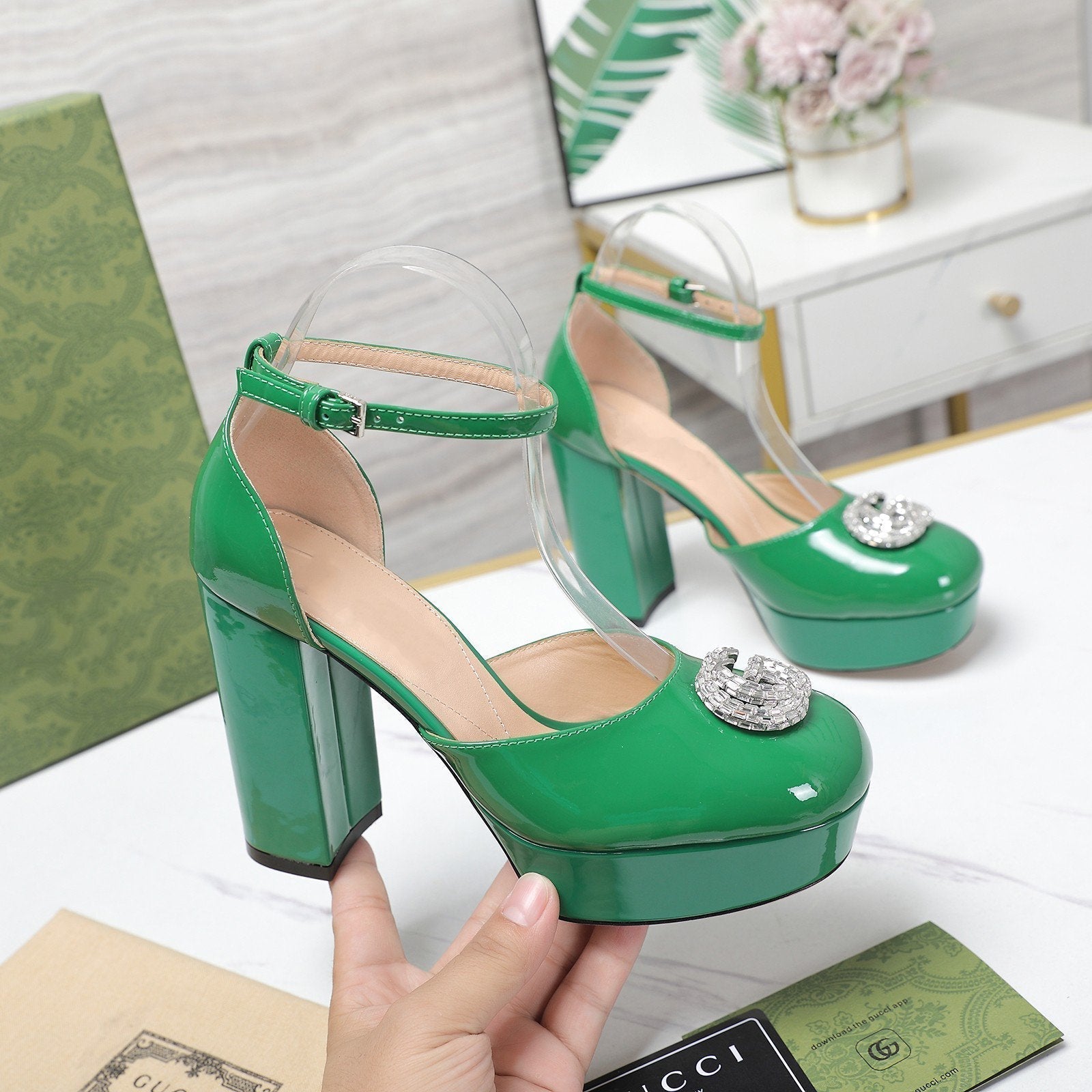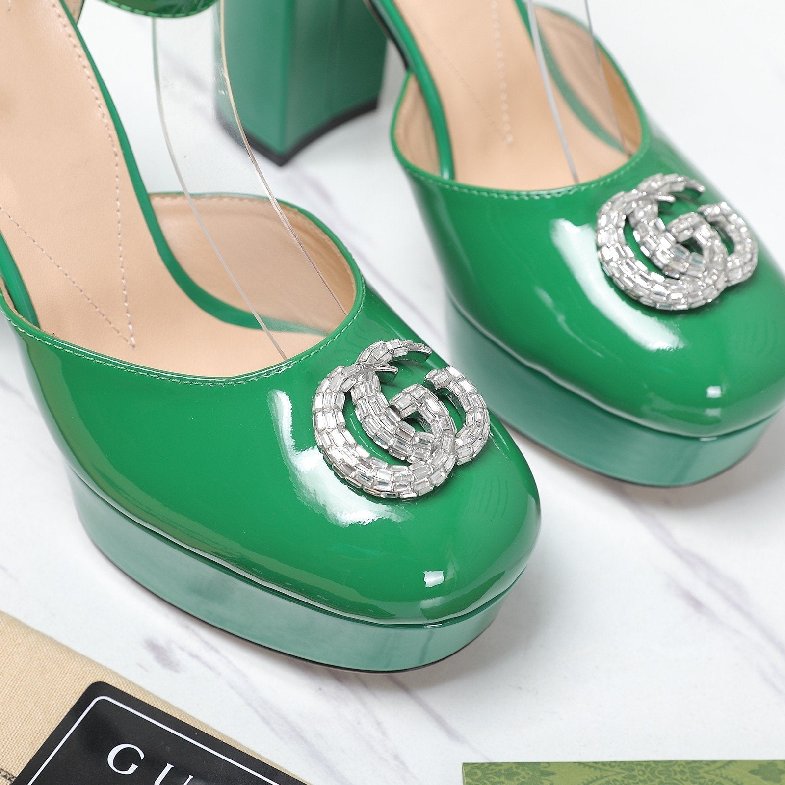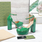 platform pump with double g green patent leather