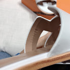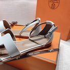 - Material: Sandal in Epsom leather with straight cut edges, "H" cut-out detail and thin ankle strap.