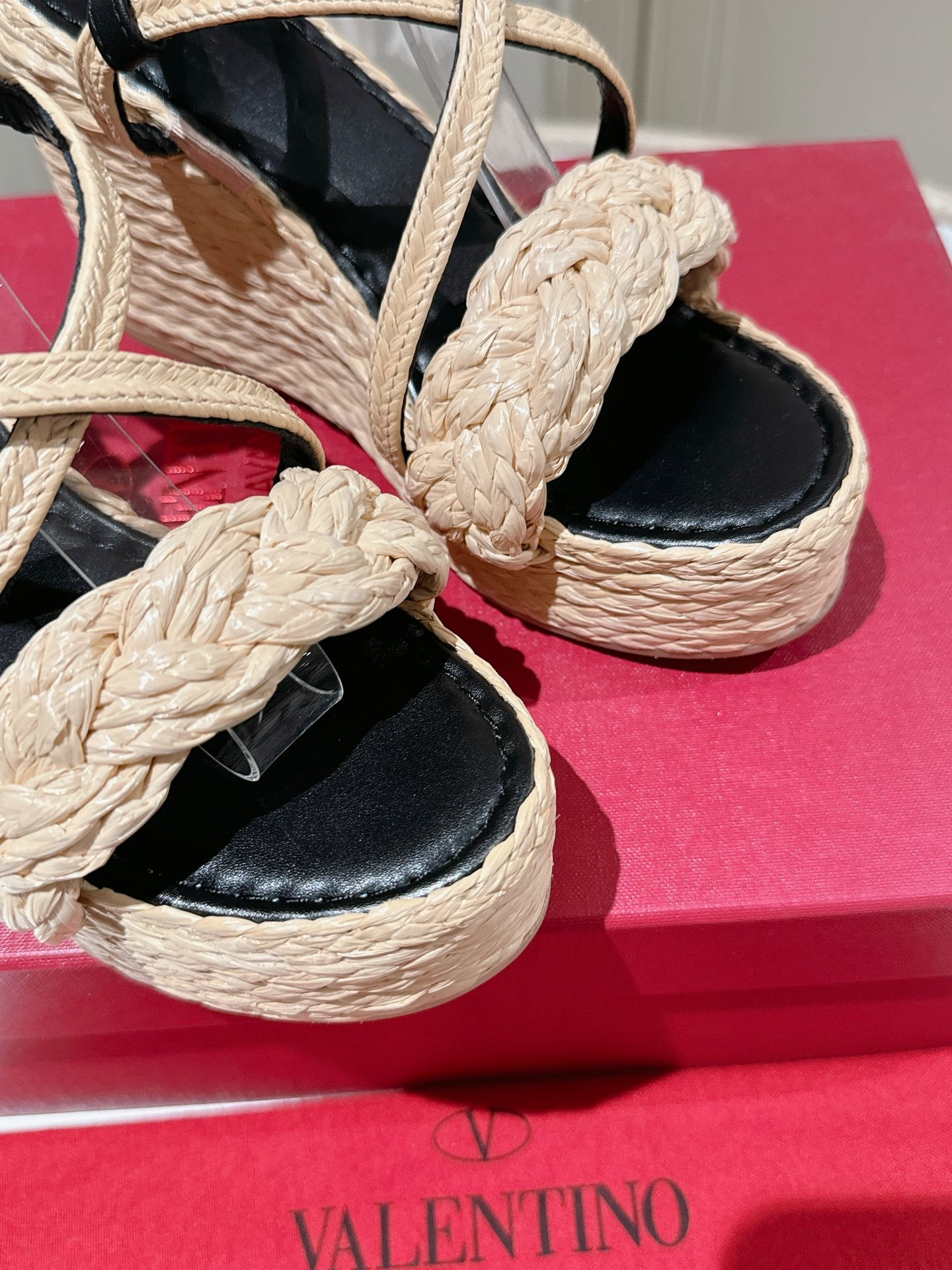 Valentino Garavani Taupe Wedge Rockstud Sandals 10mm In Black Calfskin And Beige Raffia 829385