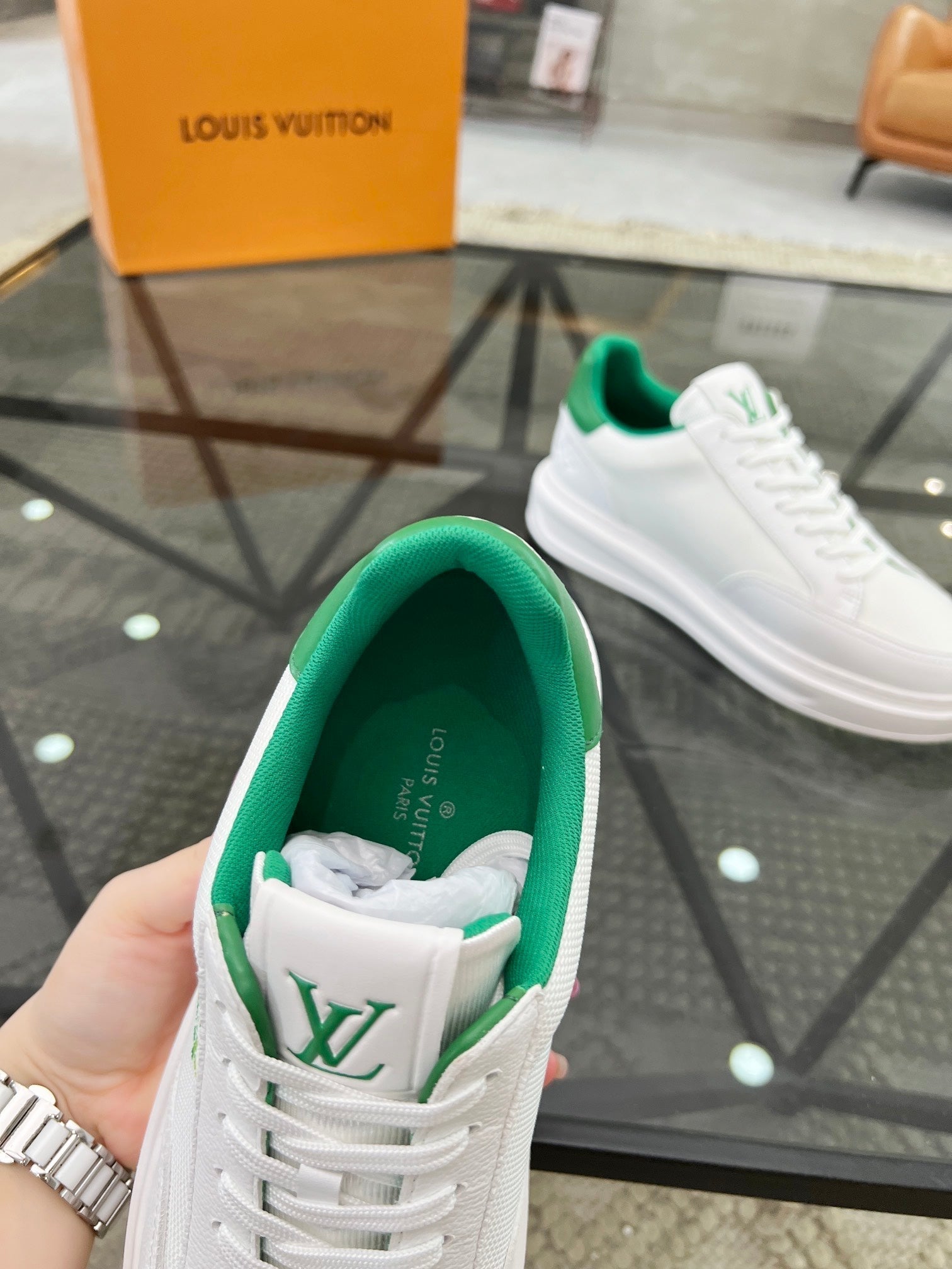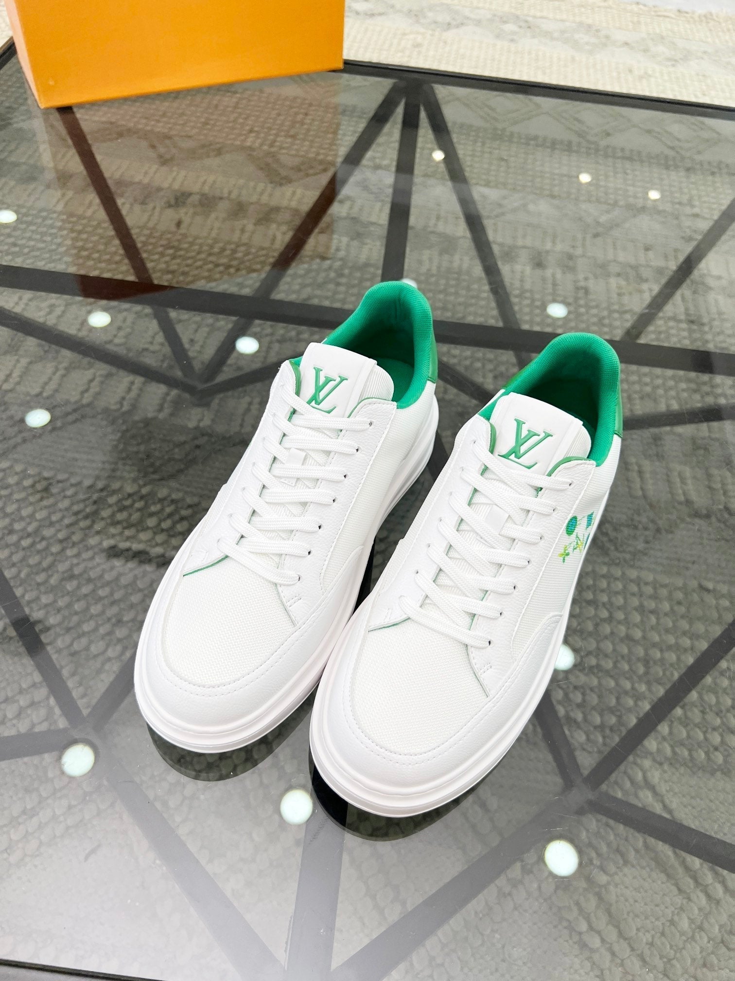 BEVERLY HILLS TRAINERS WHITE MIX COOL GREEN CALFSKIN AND MESH FABRIC