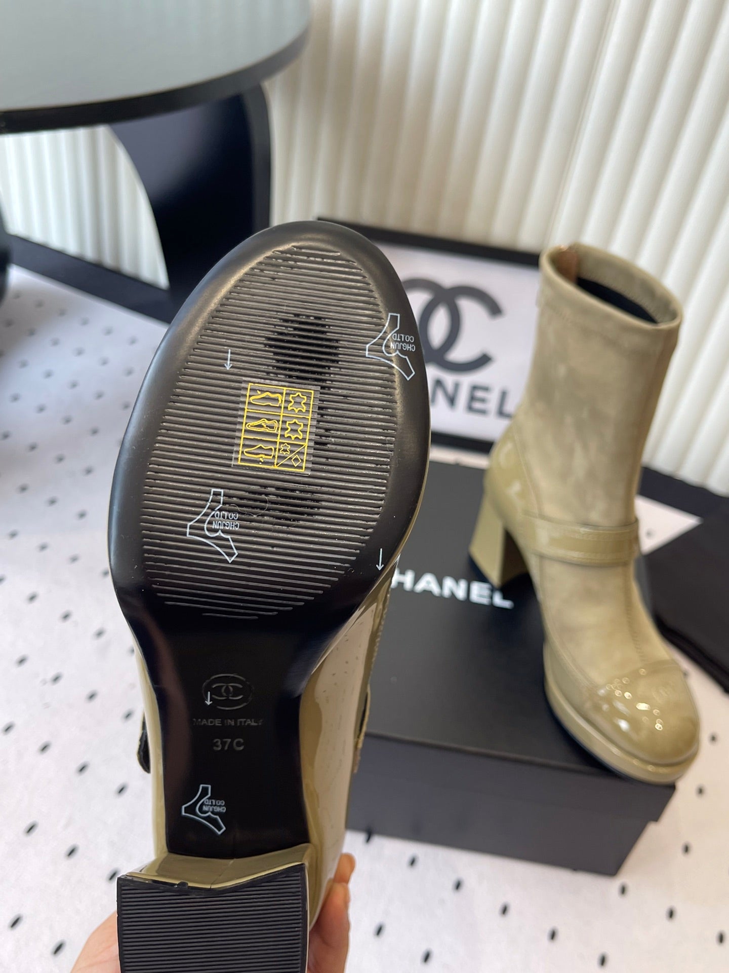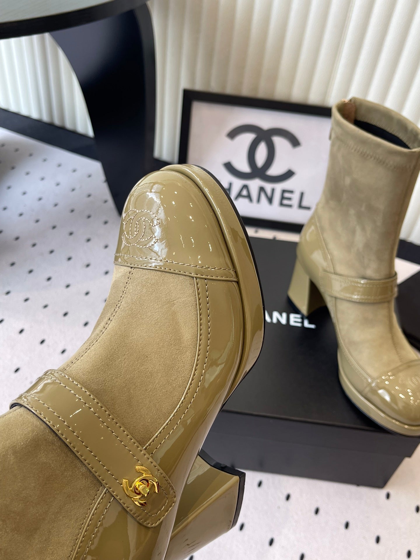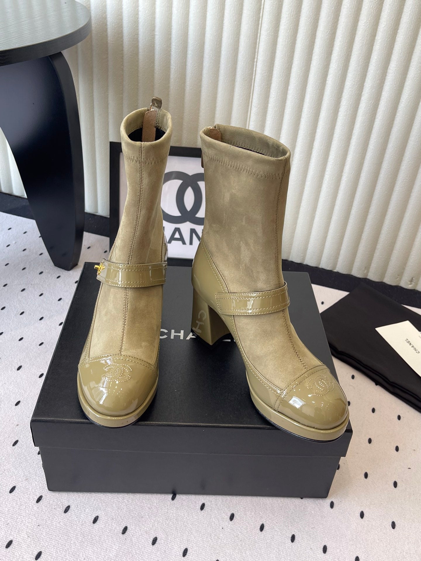 CC 25 Short Boot Olive Green Suede Patent Leather 514104