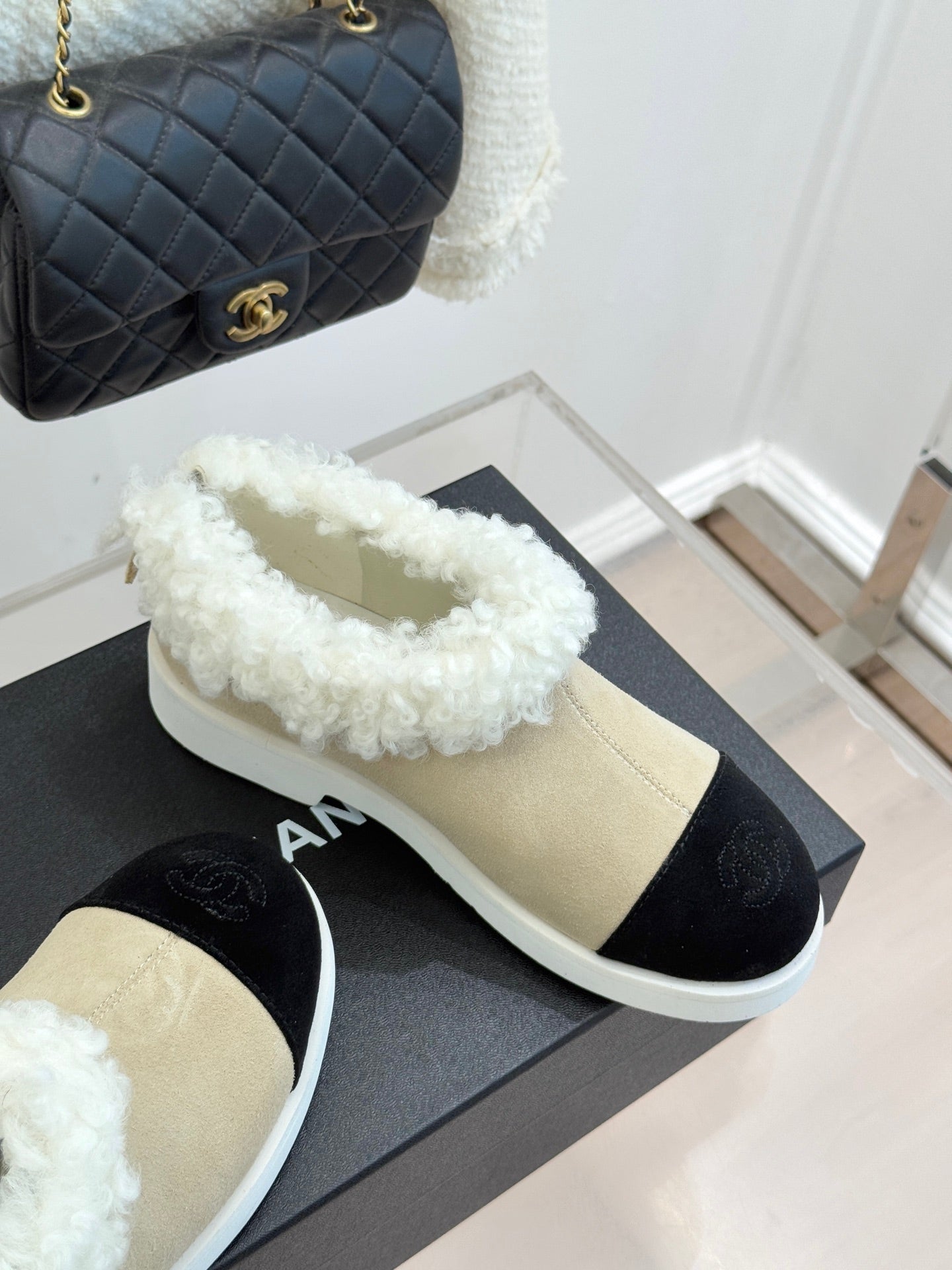 CC 25s Furry Snow Boots Beige Black Suede Wool 512063