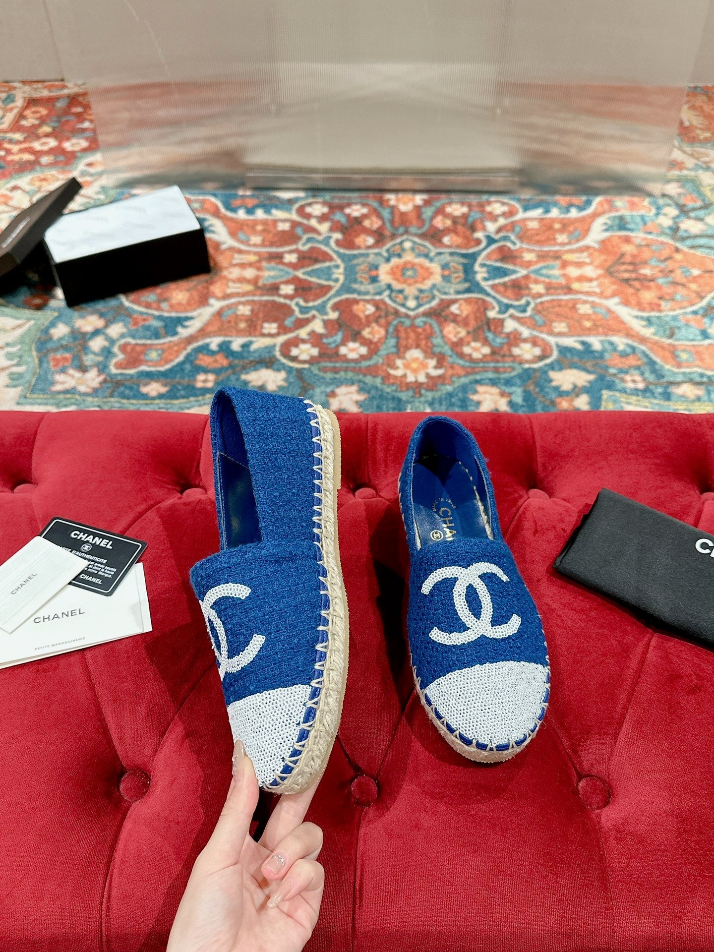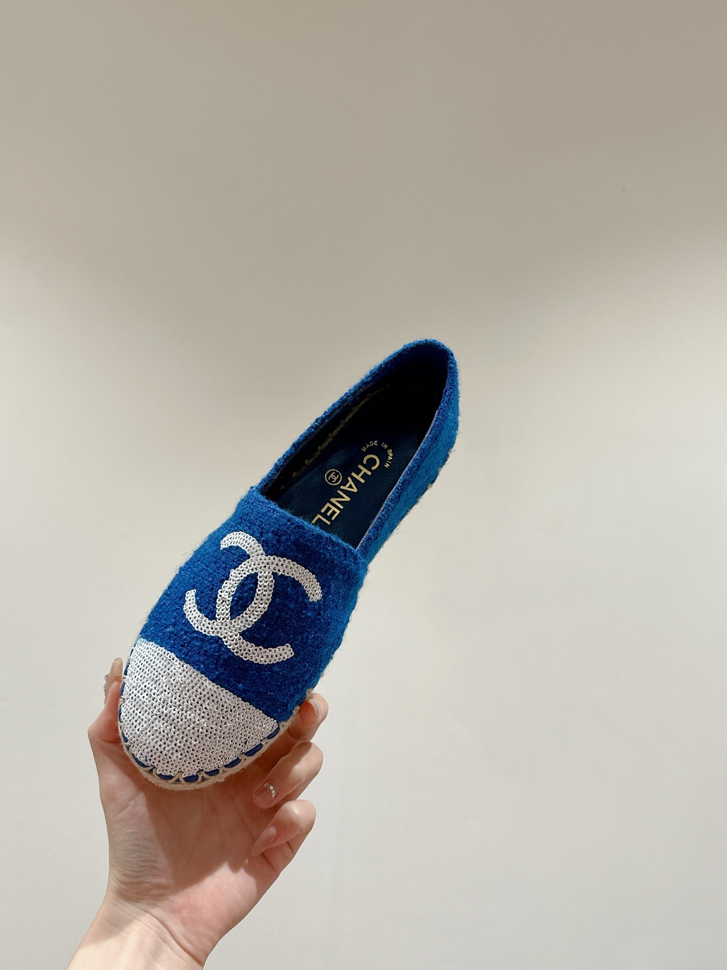 cc espadrilles blue cotton tweed white sequin