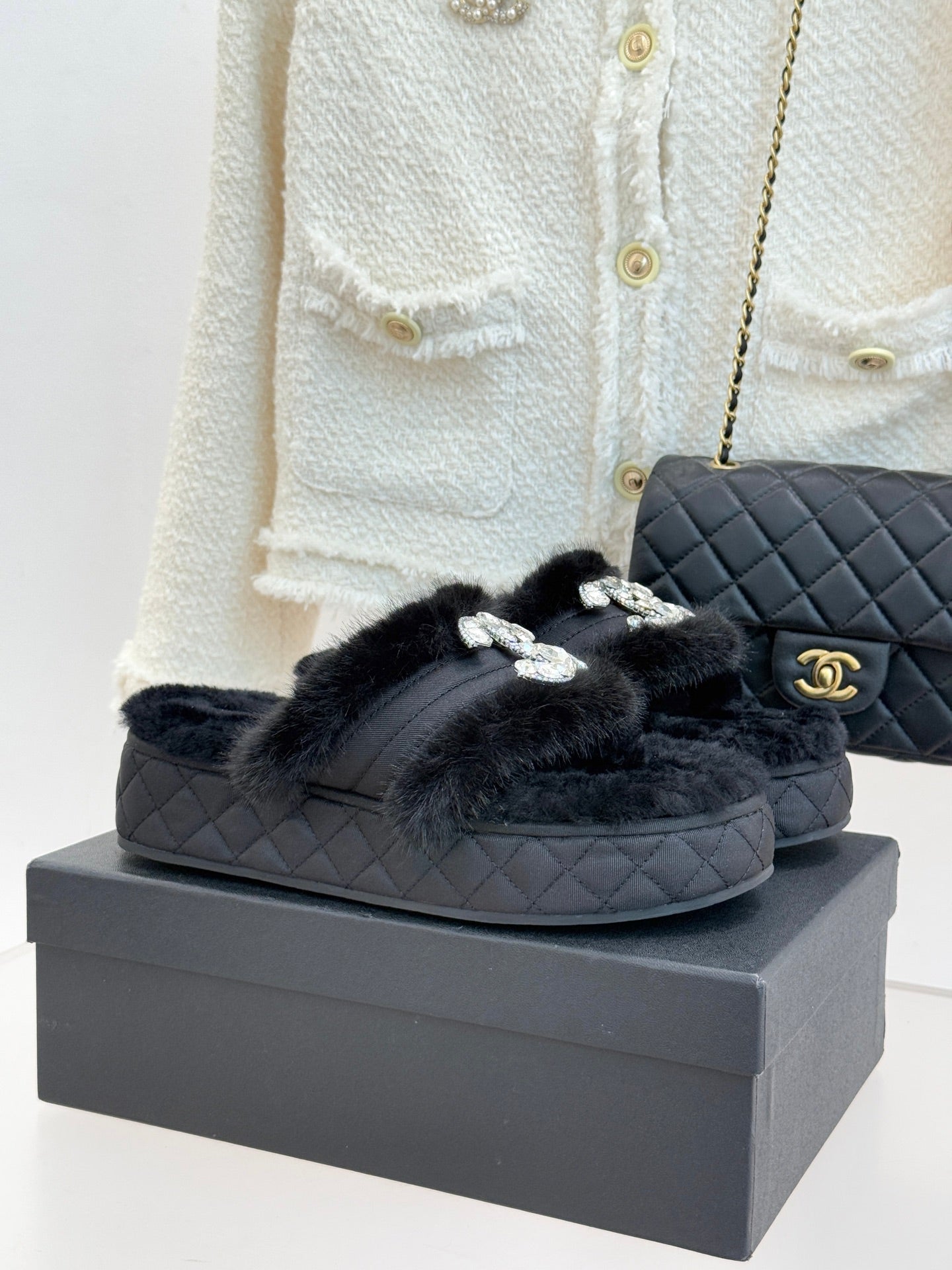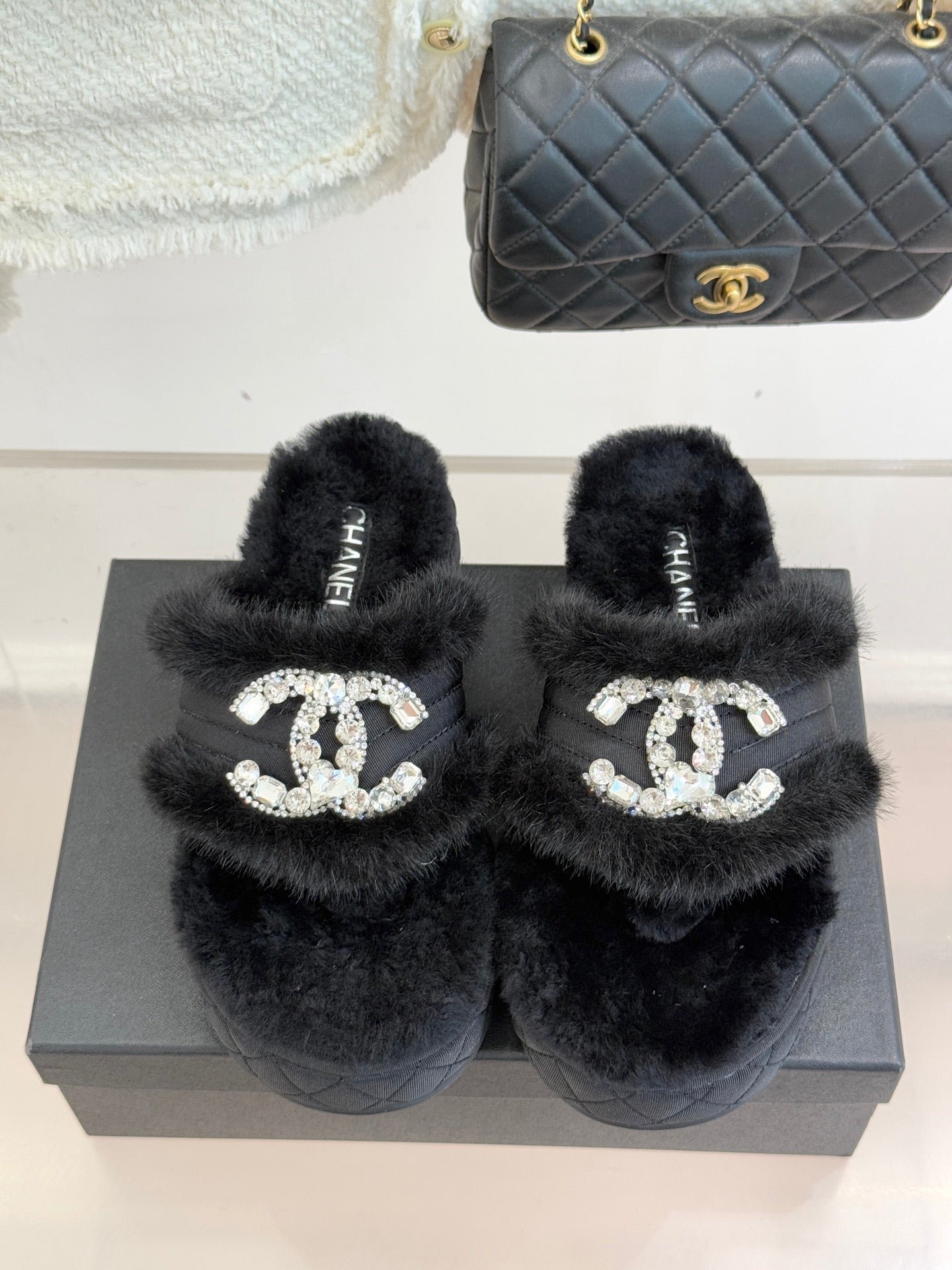 CC slipper double C rhinestone buckle black wool 512051