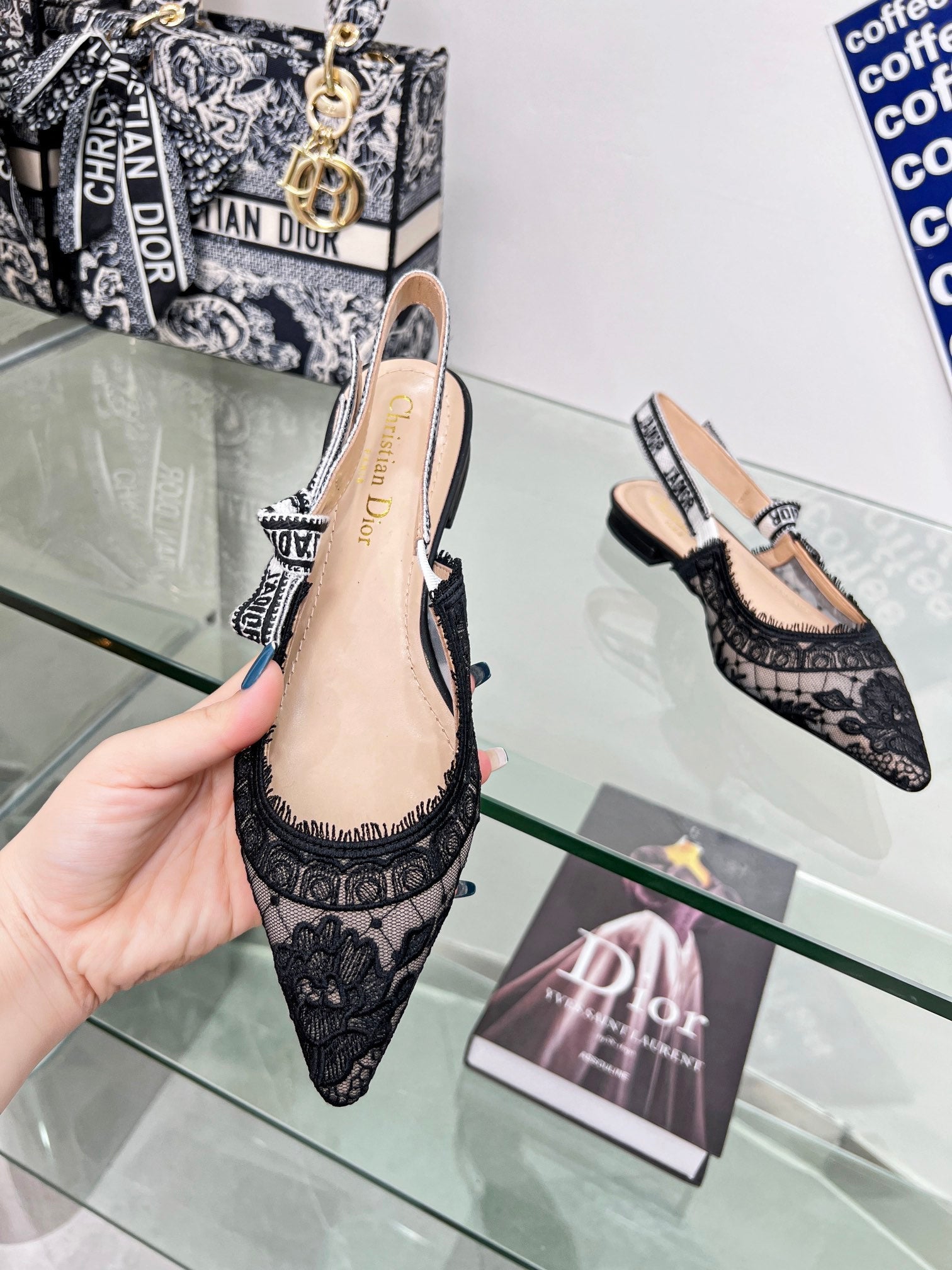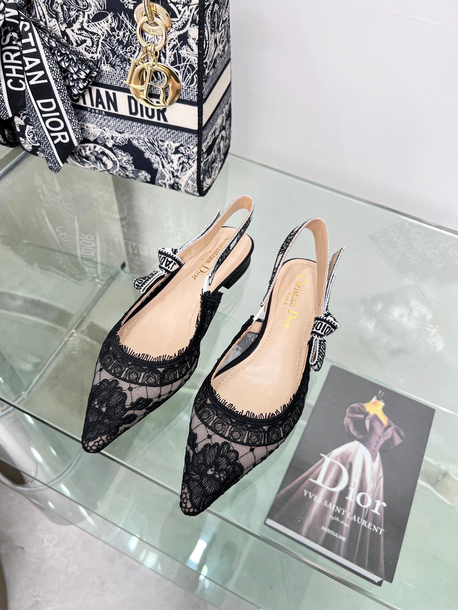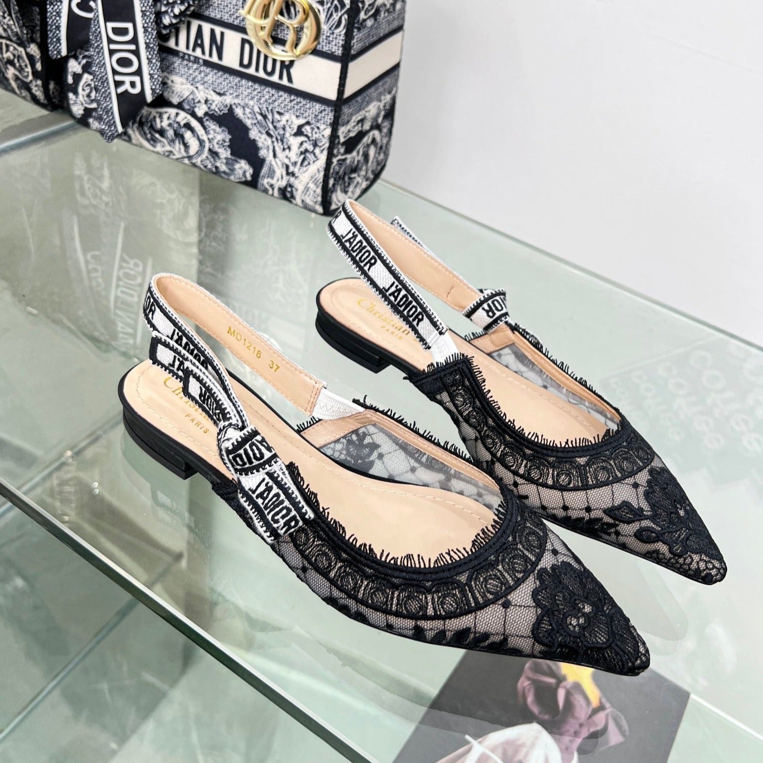 cd slingback flat transparent mesh embroidered black flower moitf