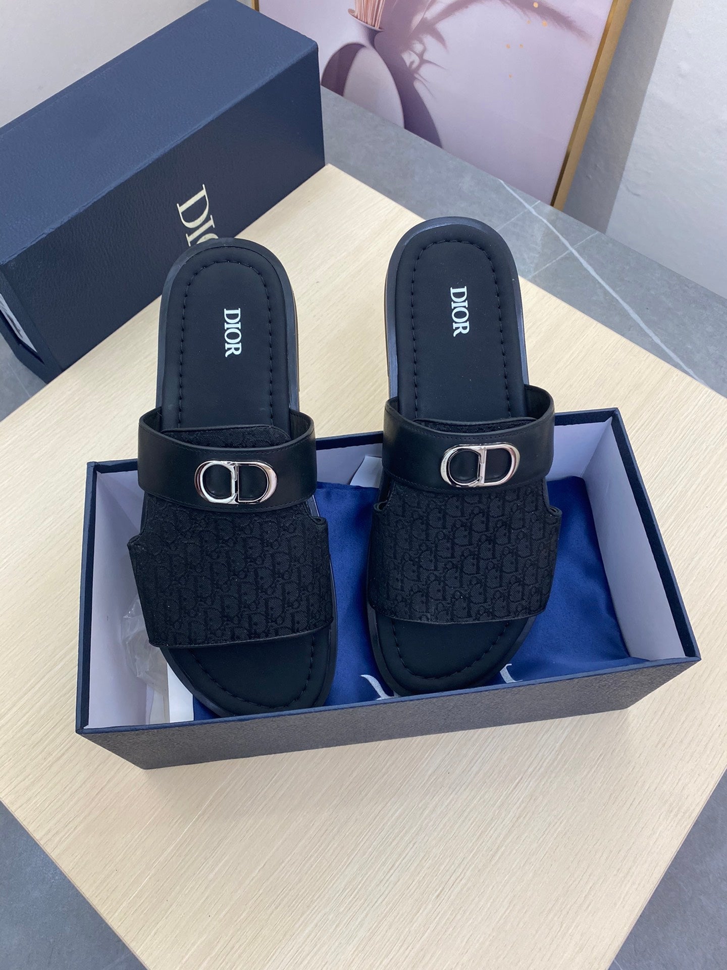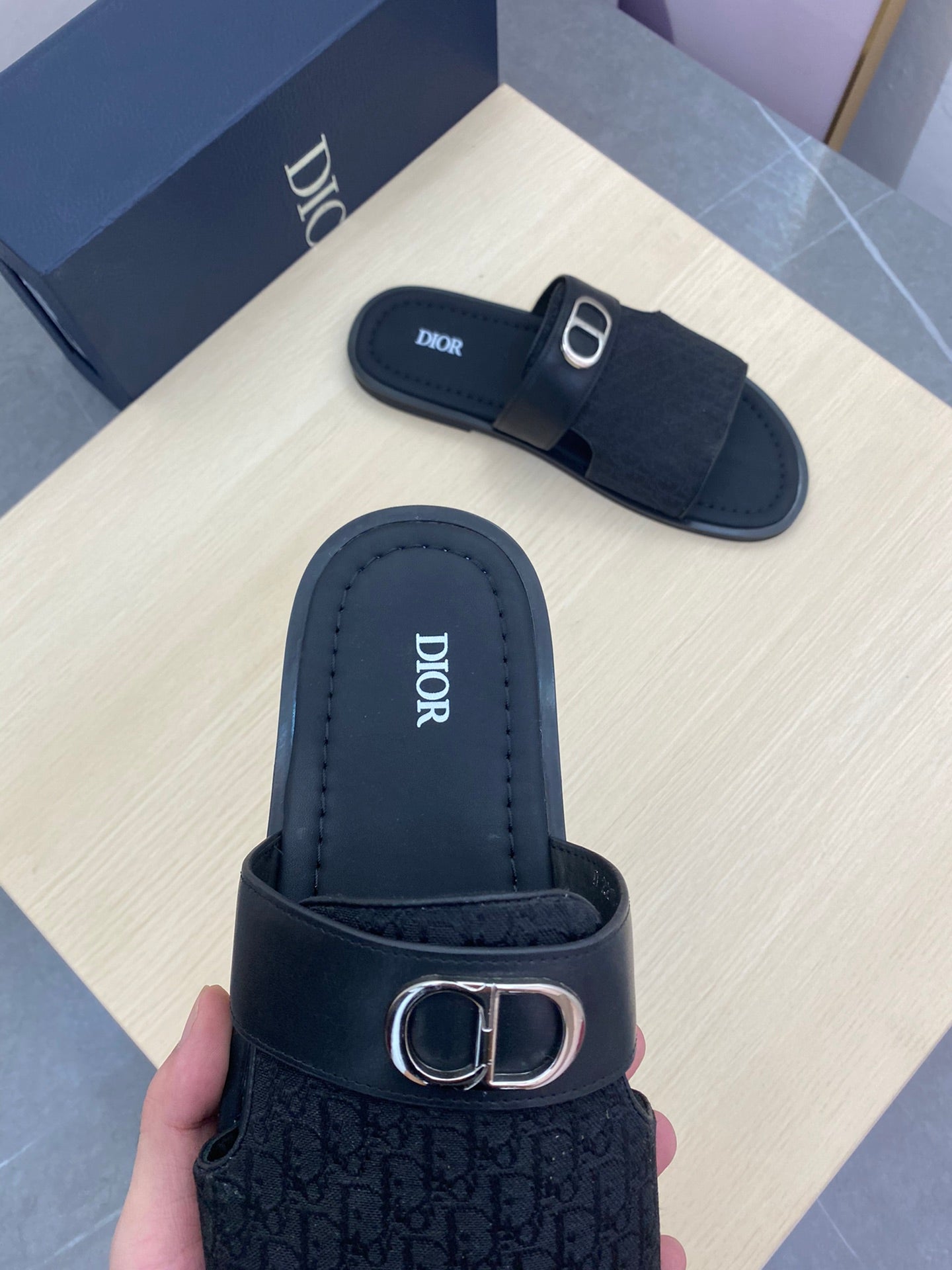 CD SYMBOL SLIDE CUT SANDAL BLACK JACQUARD