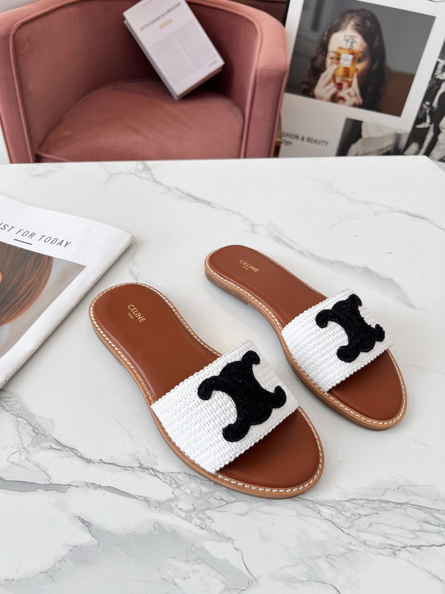 Celine 25C Slippers White mix Black Fabric with Calfskin 238150