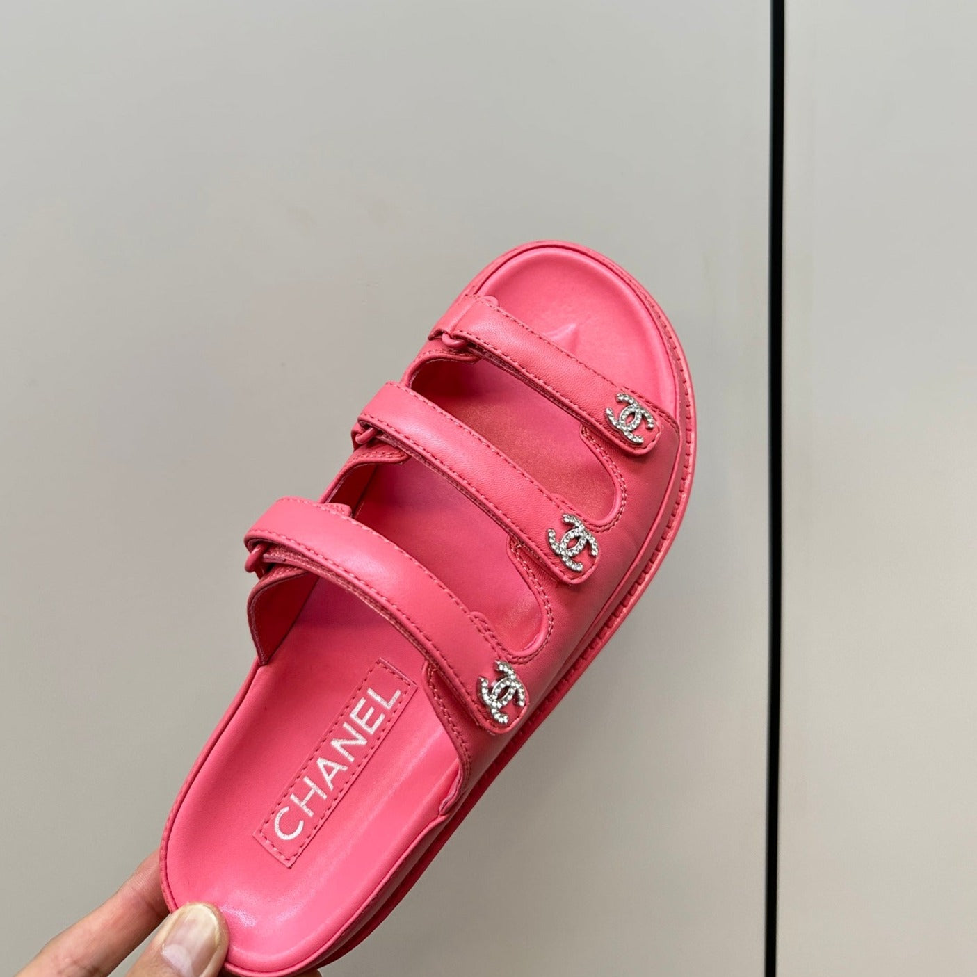 dad sandals dark pink triple strap lambskin mules