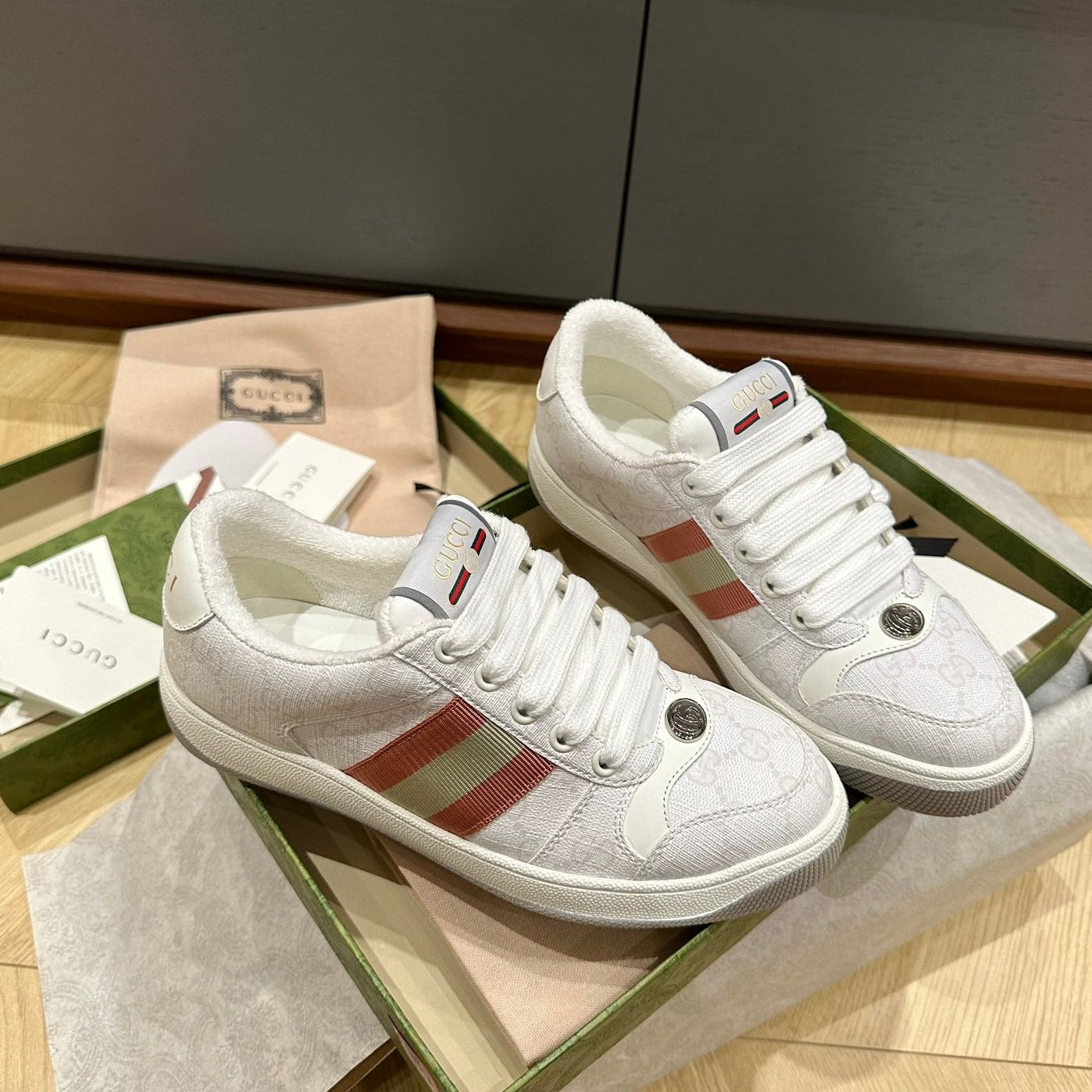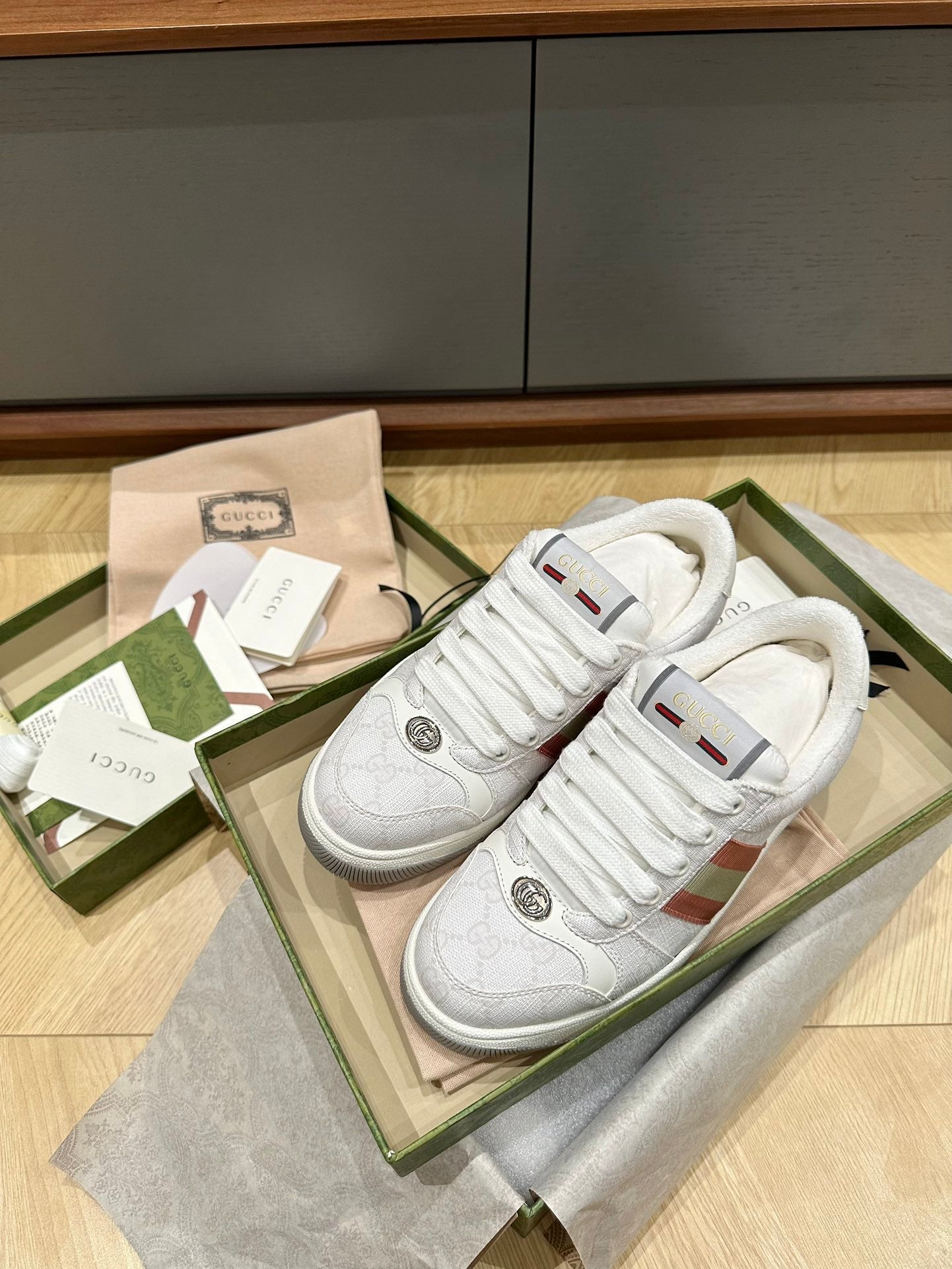 GG WOMEN'S SCREENER TRAINER LIGHT GRAY CALFSKIN