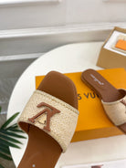 lv capri flat mule beige raffia dark brown calfskin