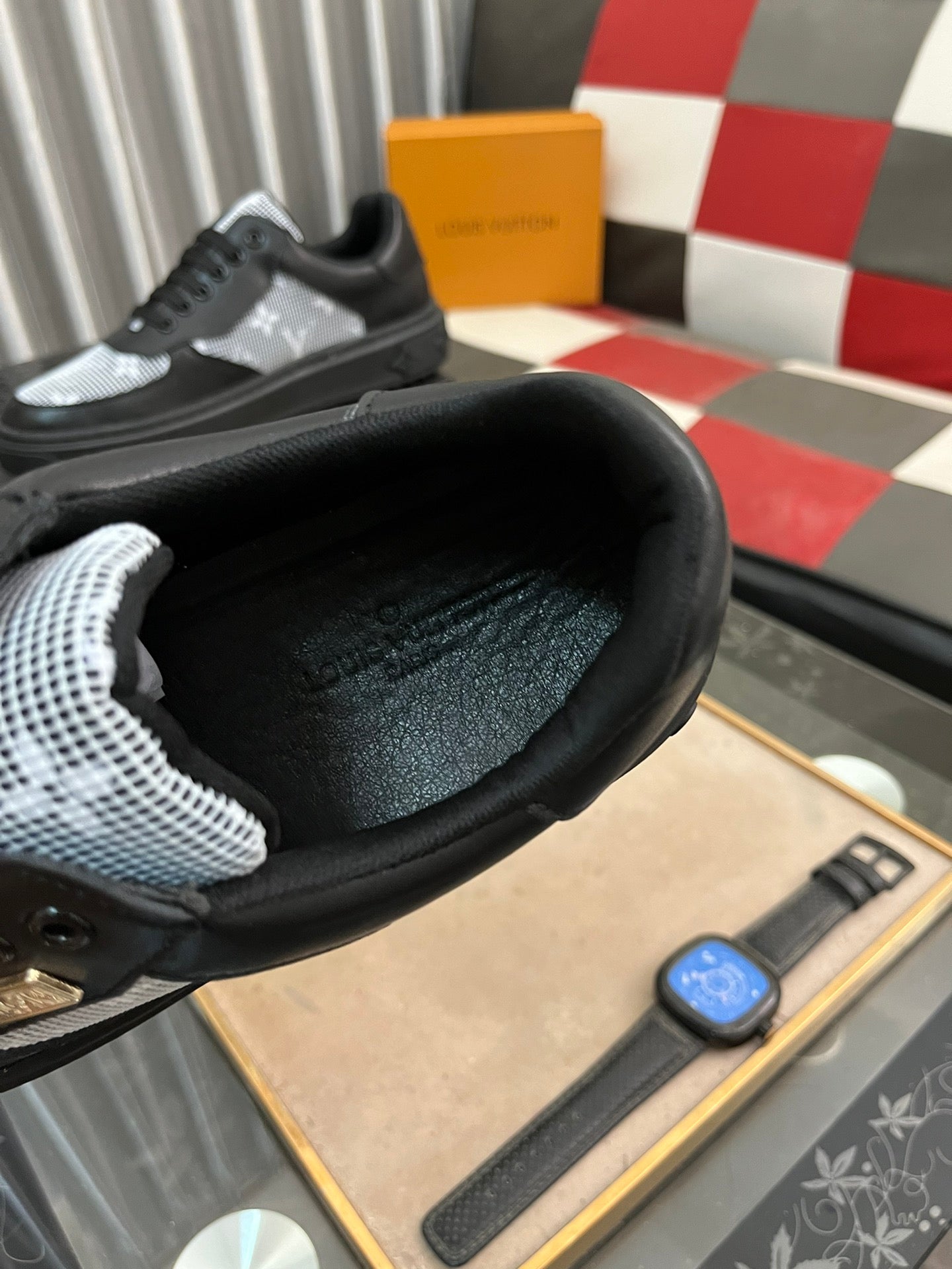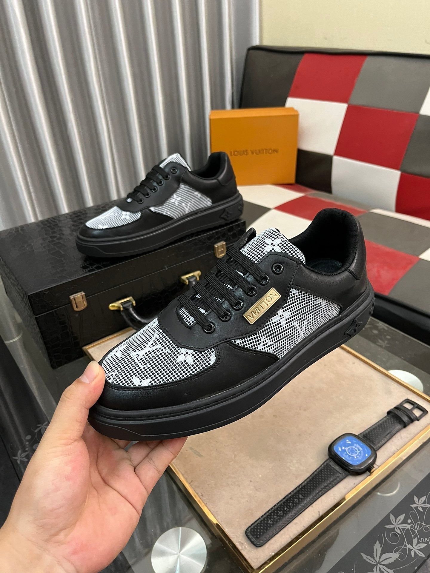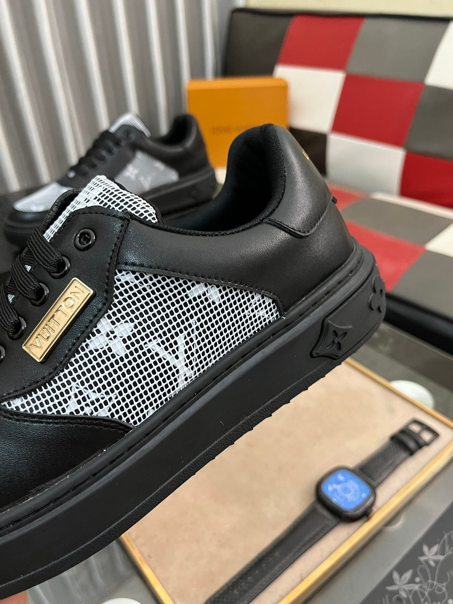 LV CLASSIC TRAINERS WHITE MESH AND BLACK CALFSKIN
