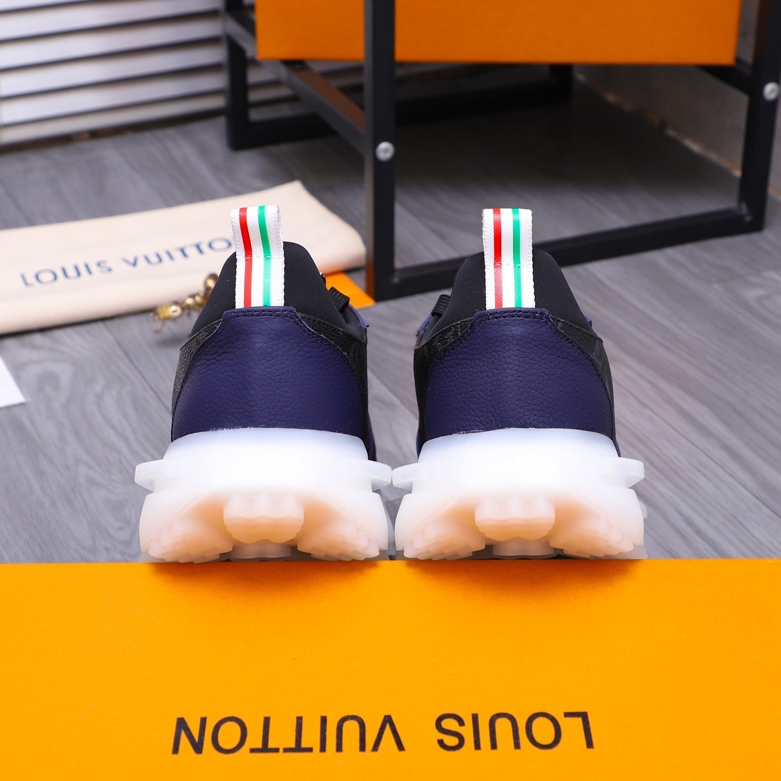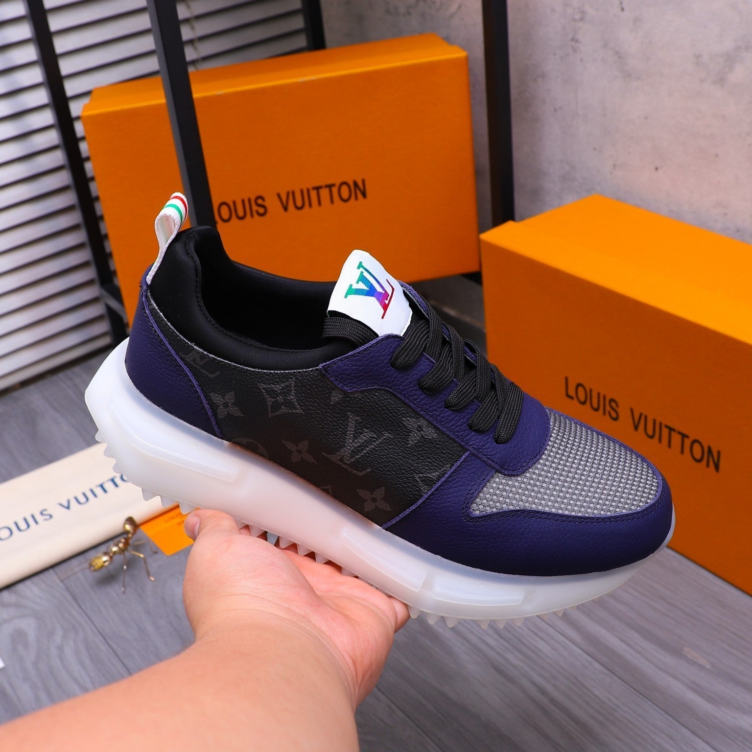 LV SNEAKER BLACK MIX NAVY BLUE CALFSKIN AND GREY MESH BREATHABLE